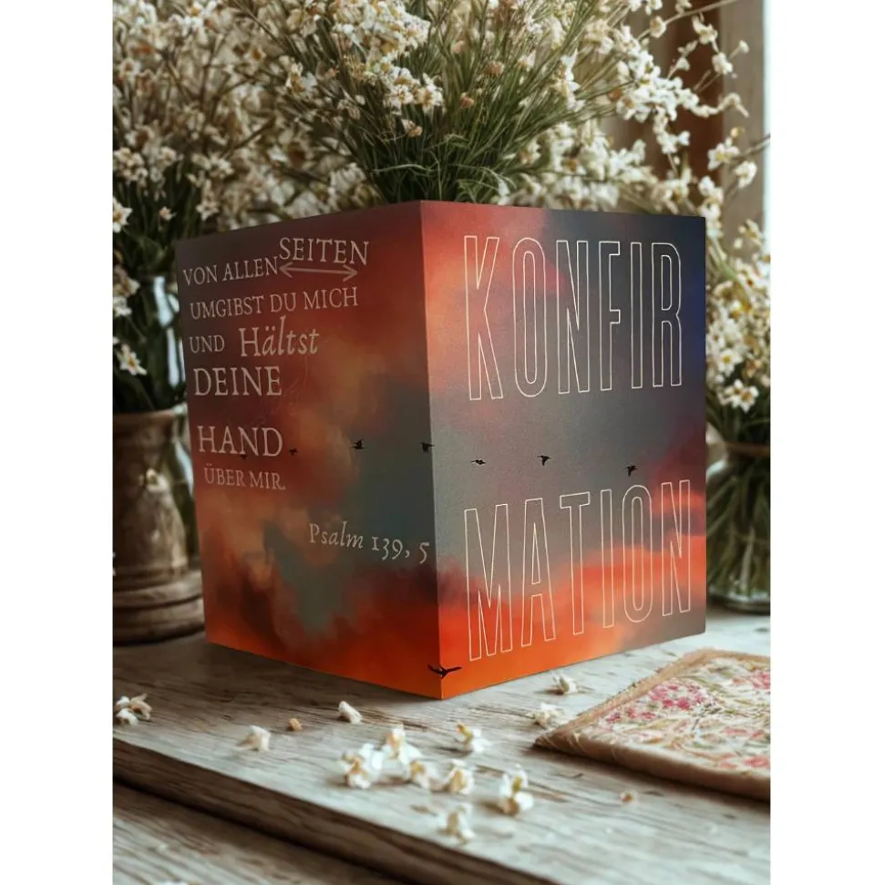 • Vorderseite: Die moderne, filigrane Outline-Typografie des Wortes „KONFIRMATION“ lässt das Hintergrundmotiv – einen weiten Abendhimmel – durchscheinen.