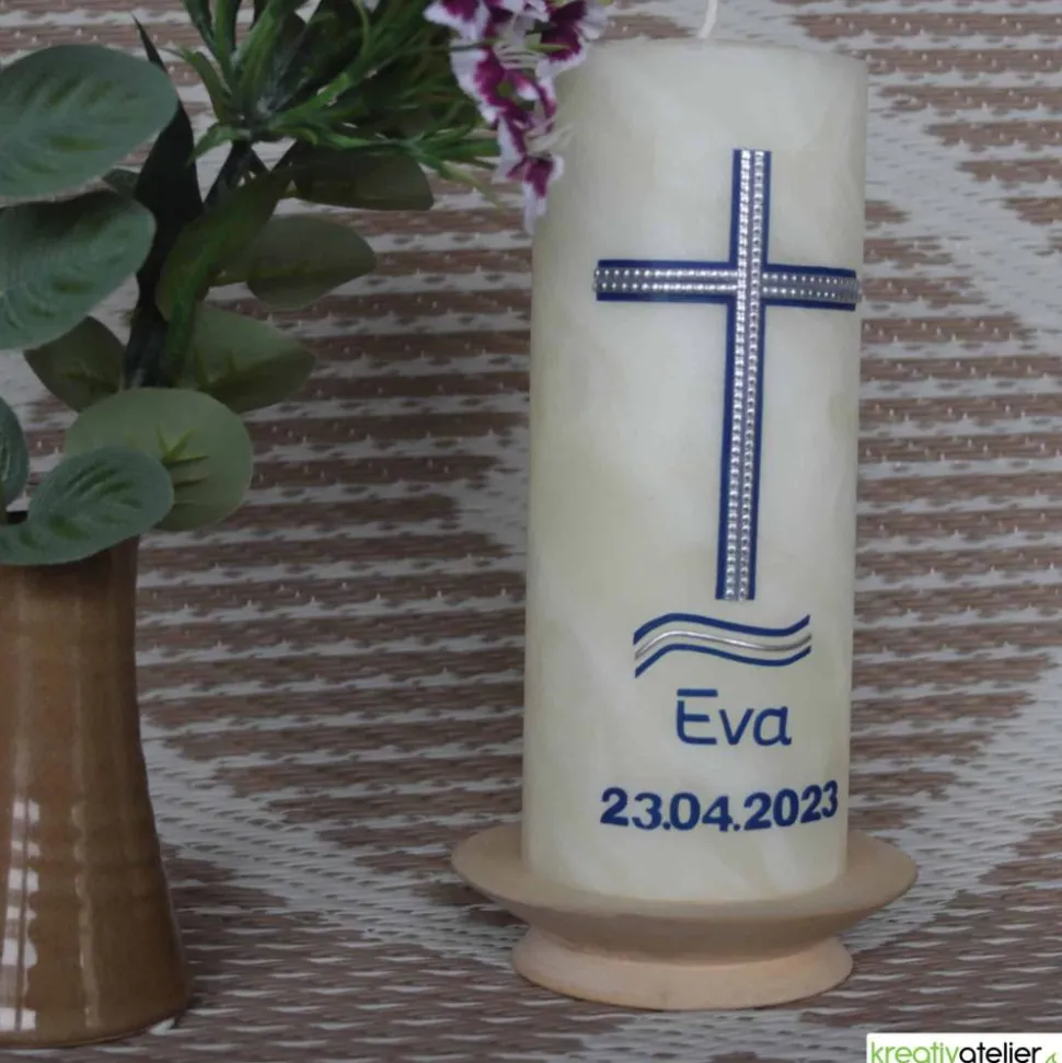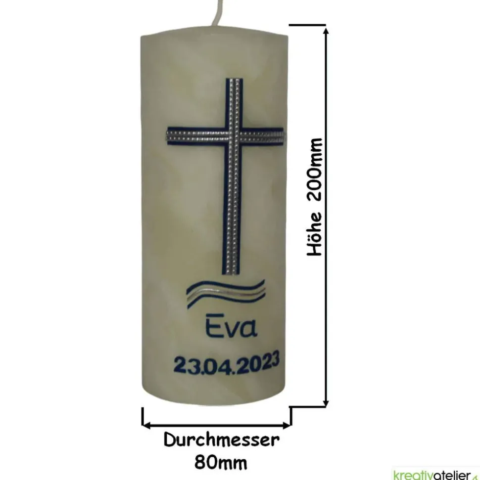 Die elfenbeinfarbene Bienenwachskerze wird von einem blau-silbernen Kreuz und Wellen aus echtem Wachs geziert. Die Wellen symbolisieren dabei das Wasser, das bei der Taufe verwendet wird, während das Kreuz die Verbindung zur Kirche und zum christlichen Glauben darstellt.