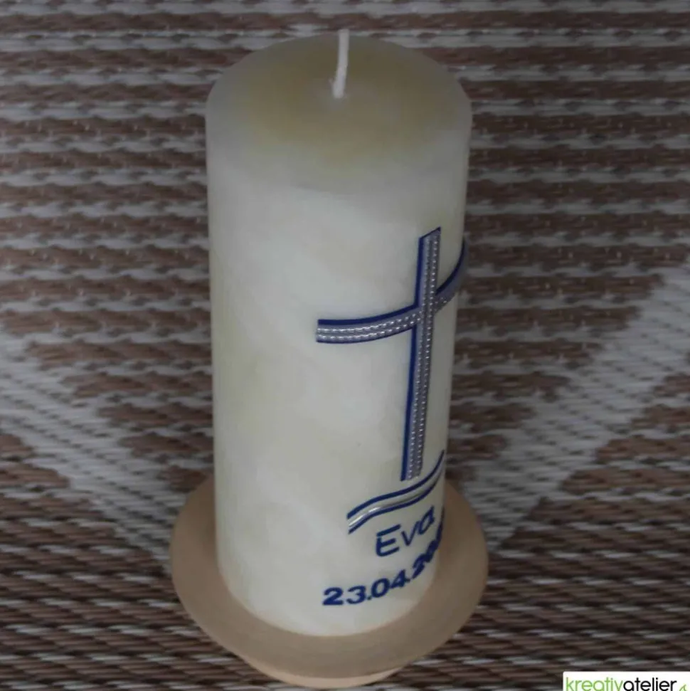 Unterhalb des Kreuzes und der Wellen kann die Konfirmationskerze mit einem Namen und dem Konfirmationsdatum personalisiert werden. Ich verwende keine Folien für die Beschriftung. Diese erfolgt mit Echtwachs.