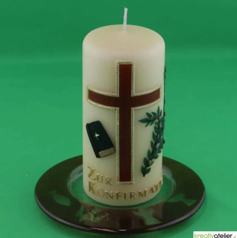 Die Konfirmationskerze kann mit Namen und Datum auf der Rückseite personalisiert werden. Diese Konfirmationskerze wird in meinem Atelier individuell für Sie gefertigt. Meine Rohlinge werden in Deutschland gefertigt und sind qualitativ hochwertig.