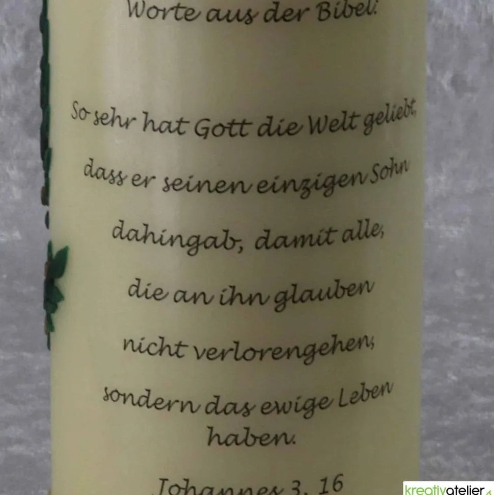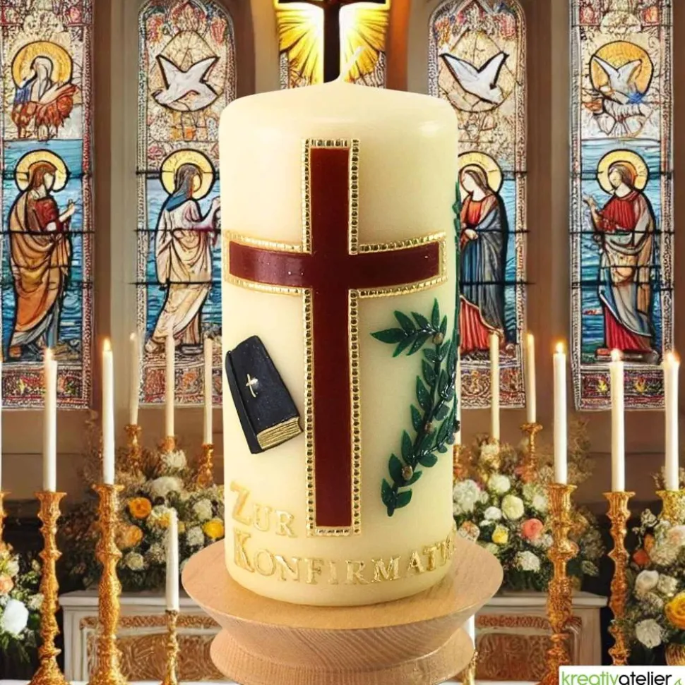 Die Konfirmationskerze „Benjamin“ ist ein besonderes Symbol für den Konfirmanden. Das braune Kreuz und die Bibel zeigen seine Verbindung zum Glauben und die Efeuranke symbolisiert Wachstum und Stärke. Auf Wunsch kann auf der Rückseite auch ein passender Konfirmationsspruch hinzugefügt werden, um die Kerze noch persönlicher zu gestalten. Diese Konfirmationskerze wird sicherlich eine bleibende Erinnerung an diesen wichtigen Tag im Leben des Konfirmanden sein.