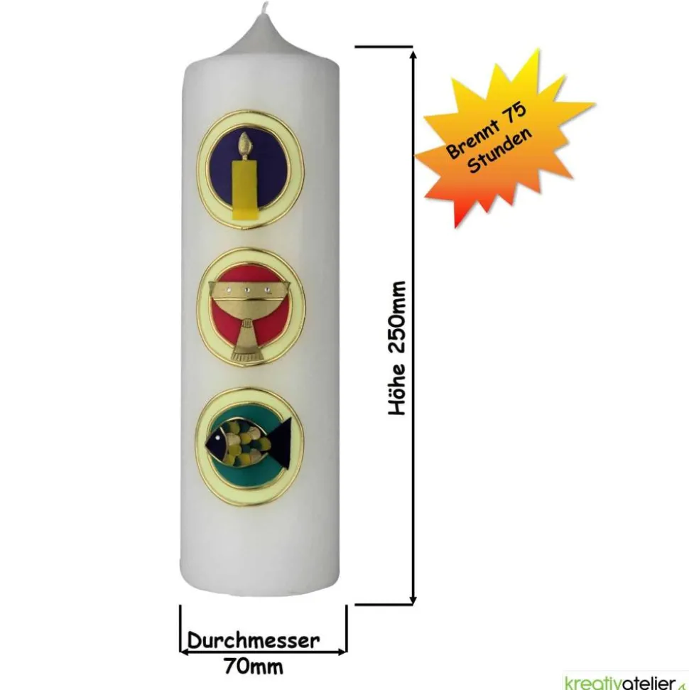Liebevoll und aufwändig gestaltete Konfirmationskerze mit drei Kacheln, die die christlichen Symbole Licht, Kelch und Fisch abbilden. Die Kacheln bestehen aus zwei Wachslagen und sind mit einem feinen Goldstreifen umrandet. Sie heben sich somit deutlich von der Kerze ab und verleihen ihr so etwas Edles, Erhabenes.