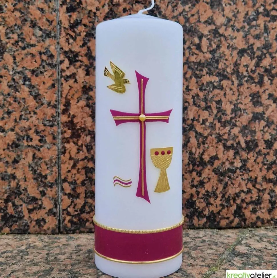 Unterhalb des Kreuzes ist speziell Platz vorgesehen, um den Namen des Konfirmanden oder der Konfirmandin einzufügen, und der umlaufende brombeerfarbige Streifen bietet idealen Raum für das Konfirmationsdatum. Diese persönliche Note macht jede Kerze zu einem einzigartigen Andenken an diesen besonderen Lebensabschnitt.