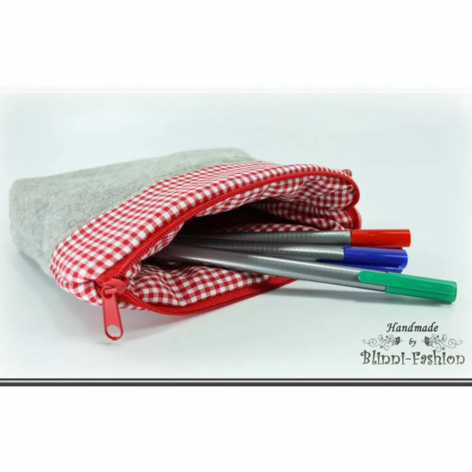 Genäht wurde das Täschchen aus hellgrau meliertem Kashmir/Wollstoff und mit einer tollen Hirsch und Herz Applikation oder Herz mit HERZILEIN versehen. Innen ist er farblich passend gefüttert und leicht verstärkt.