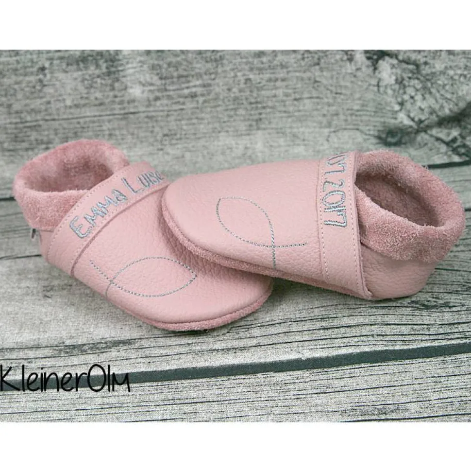 Gerne kann auch nur auf einen Schuh ein Motiv gestickt werden und auf den anderen der Name oder ein anderes Motiv