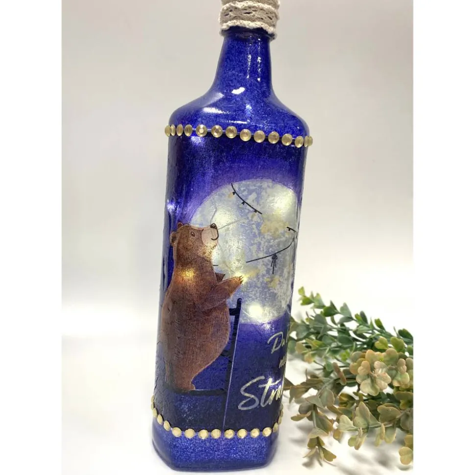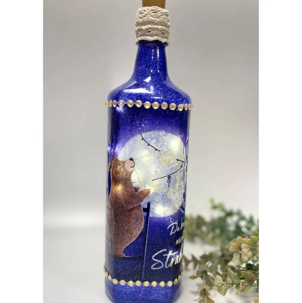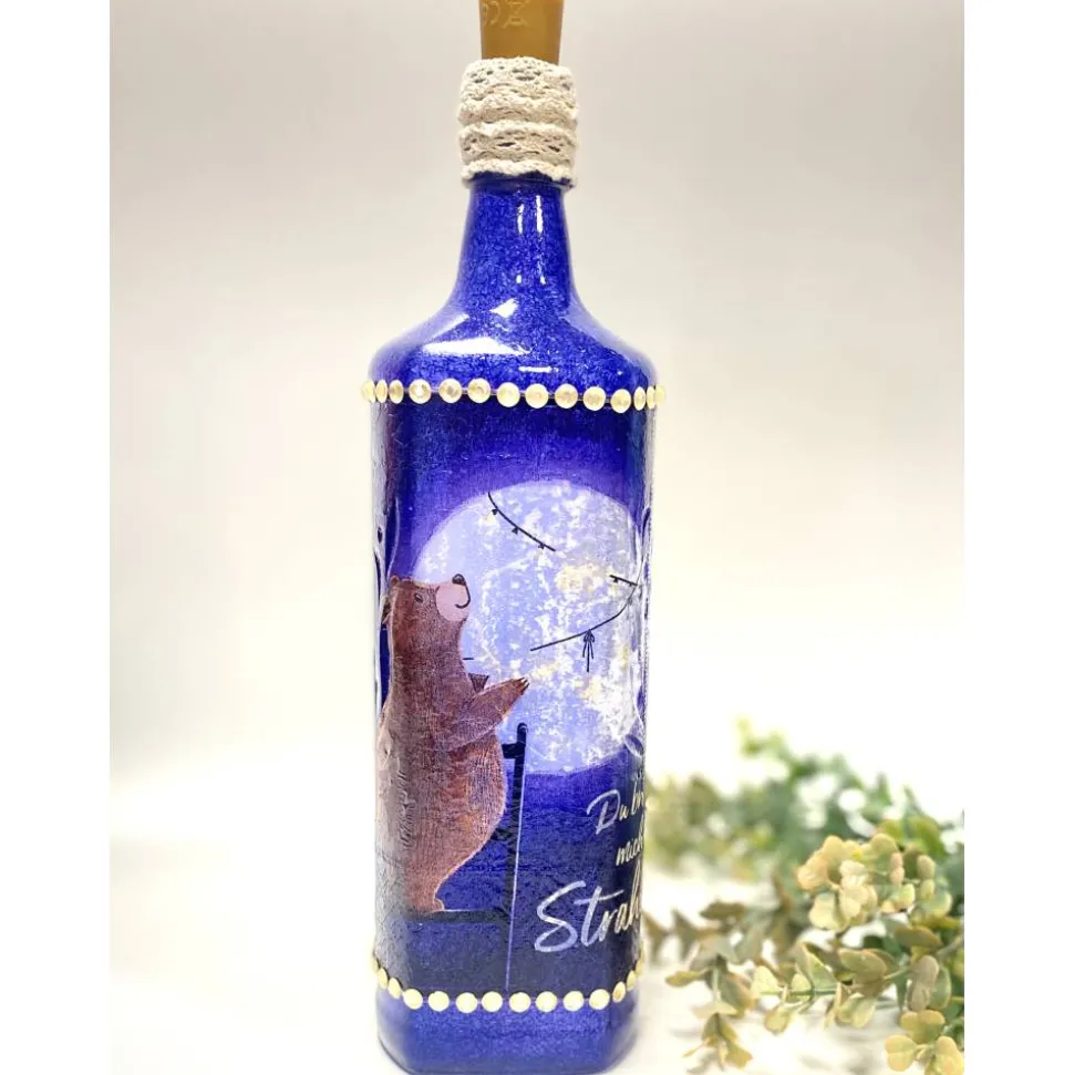 Ich nehme leere Flaschen und beklebe sie mit dem Servierttenmotiv. Wenn dieses getrocknet ist, bemale und gestalte ich die Flasche und lasse sie trocknen. Zum Schluss sprühe ich die ganze Flasche mit Klarlack ein, damit man sie feucht abwischen kann.
