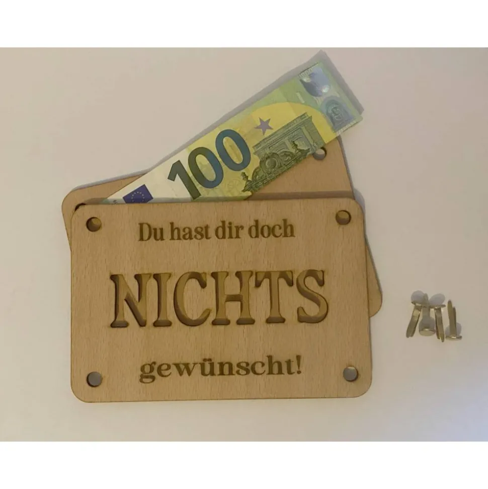 Diese Geldgeschenk-Verpackung aus Buchen-Sperrholz ist eine originelle und einfache Möglichkeit, Geld stilvoll zu verschenken. Sie besteht aus zwei Holzplatten. Auf der Vorderseite steht der Spruch „Du hast dir doch nichts gewünscht“. Durch die vier beiliegenden Metallklammern lassen sich die Platten sicher verschließen.