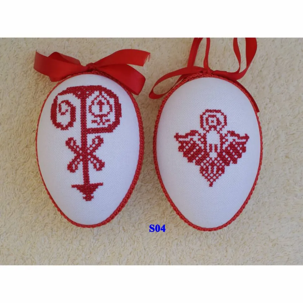 Das Ei ist beidseitig mit verschiedenen Motiven, in Kreuzstich, bestickt und mit Schleife und Schlingenborte verziert.