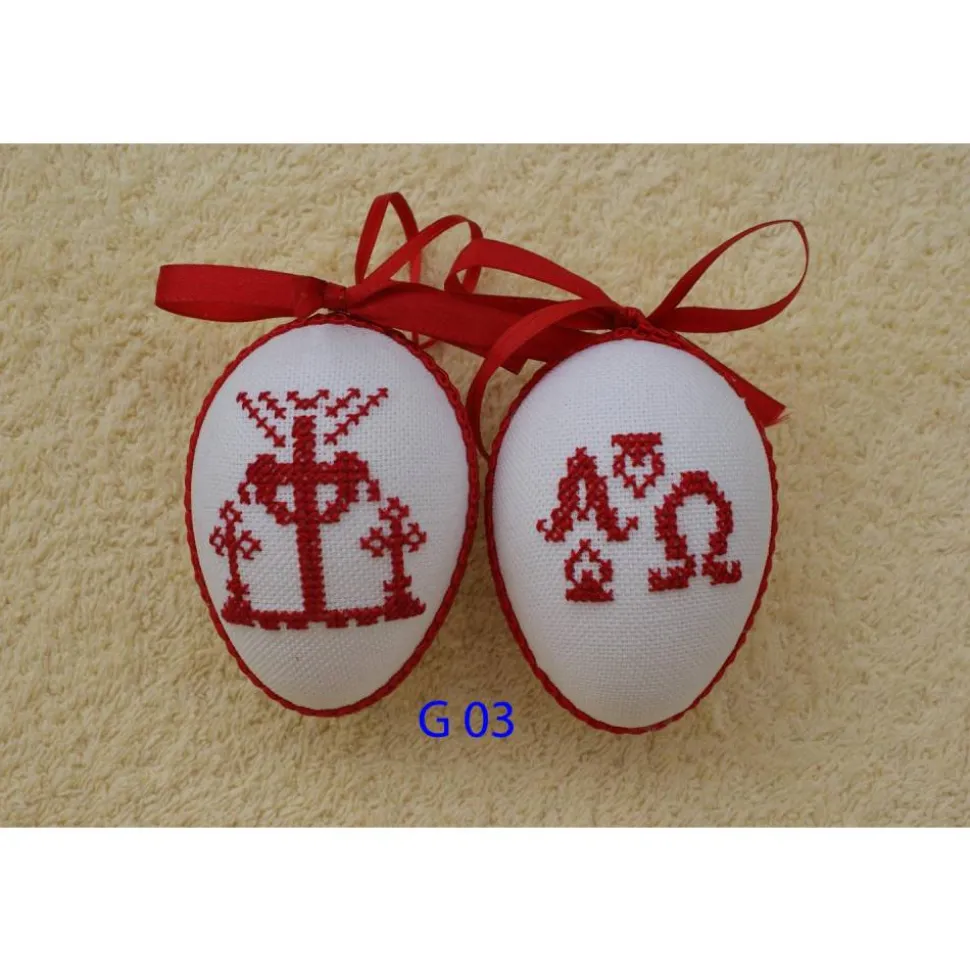 Das Ei ist beidseitig mit verschiedenen Motiven, in Kreuzstich, bestickt und mit Schleife und Schlingenborte verziert.