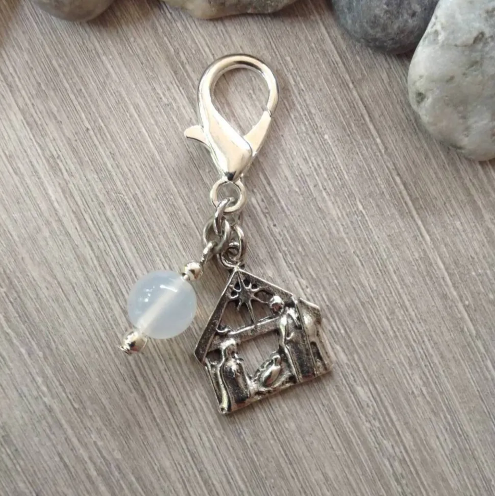 Der kleine Krippenstall besteht aus Metall und misst 1,8 cm in der Höhe. Dank des Spaltrings ist er sicher an einem Karabiner (Höhe: 2,1 cm) befestigt, sodass du ihn bequem an Schlüsselbund, Tasche oder Rucksack anbringen kannst.