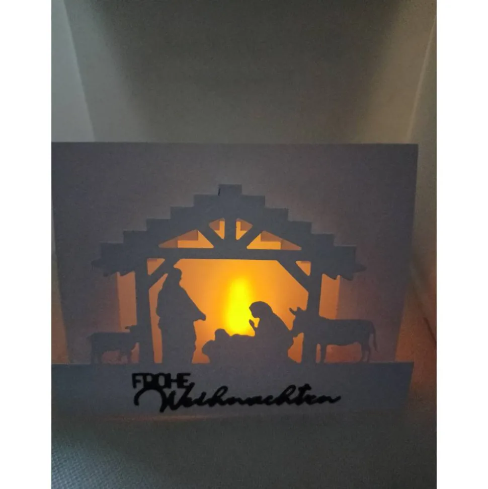 Ihr erhaltet hier eine Aufsteller-Karte mit Krippenmotiv. Die Karte ist so gestaltet, dass innen ein LED Teelicht hineingestellt werden kann. Dann scheint durch das Transparentpapier der Lichtschein hindurch und ein zauberhafter Effekt entsteht.