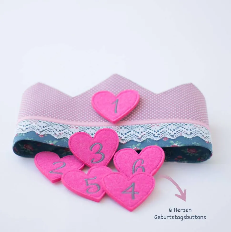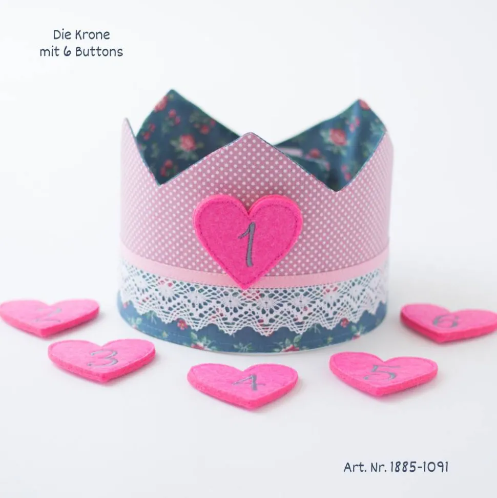 Die Geburtstagskrone besteht aus 100% Baumwolle mit einer Verstärkung aus Vlieseline-Decovil, die aus 45% Viskose, 30% Polyester und 25% Polyamid besteht, und verfügt über wechselbare Zahlen.