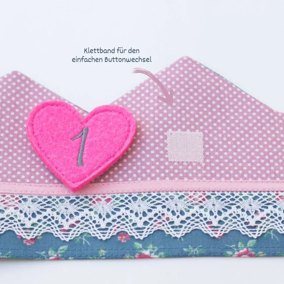 Die Krone ist aus hochwertiger Baumwolle gefertigt und in den Farben Rosa und Mittelblau mit zarten Streublümchen verziert. Sie sind mit einer breiten Spitze versehen und kann bis zum 6. Lebensjahr des Kindes genutzt werden.