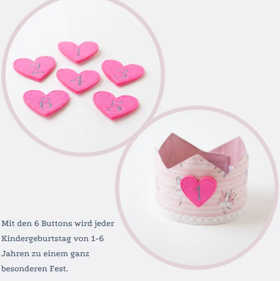 Durch die anpassbaren Zahlenbuttons in Herzform kann die Krone jedes Jahr erneut genutzt werden, sodass sie nicht nur ein einmaliges Accessoire, sondern ein Teil wunderbarer Geburtstagsrituale wird.