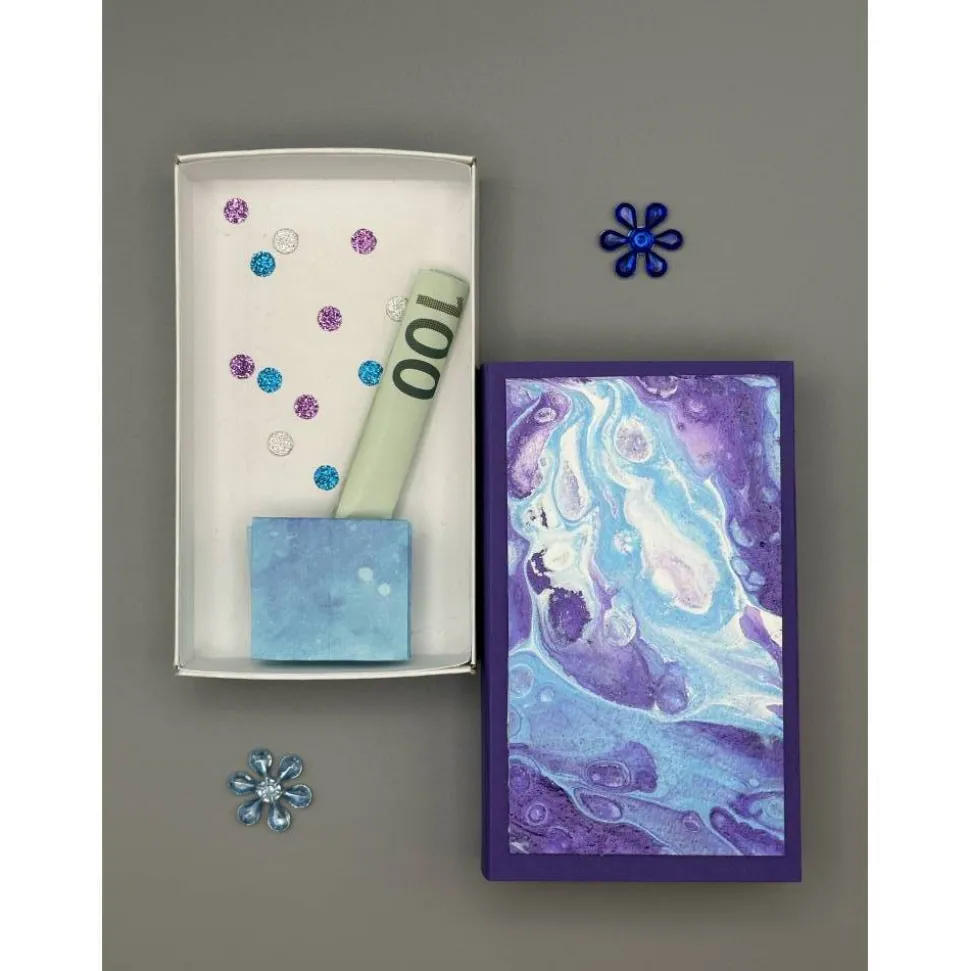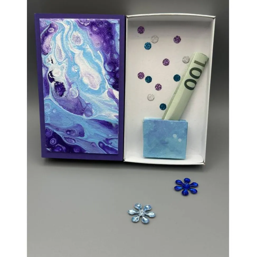 Verschenke Geld oder Gutscheine auf eine ganz besondere Art! Die kleine Kunst-Box ist eine originelle und handgefertigte Geschenkverpackung, die mit viel Liebe gestaltet wurde. Das Außenteil der Schiebeschachtel ist mit lilafarbenem Tonpapier beklebt und trägt auf der Vorderseite ein einzigartiges Bild, das in Pouring-Technik gestaltet wurde.