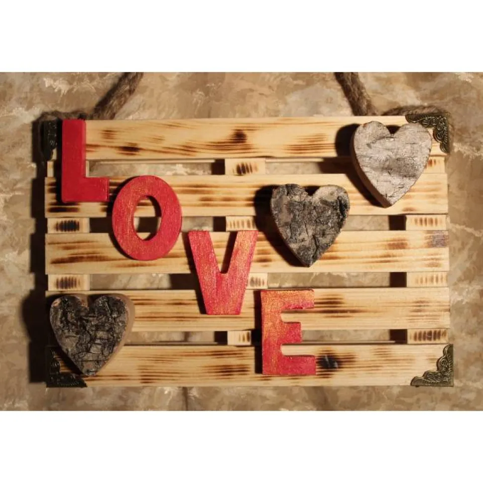 Collage auf einer abgeflammten Mini-Dekopalette im rustikalen Stil. Witzige Wohndeko, künstlerisch gestaltet mit Holzbuchtsaben, Applikationen aus Metall und Holzherzen. Wunderschöne, dezente Farben. Die Ecken sind mit rustikalen Metallecken verziert. Der Schriftzug ist aus Holzbuchstaben, die mit Acrylfarben in Rot und Gold bemalt sind. Die angebrachten Herzen sind aus Holz, mit Rinde beklebt. Als Aufhängung dient eine Sisalkordel.