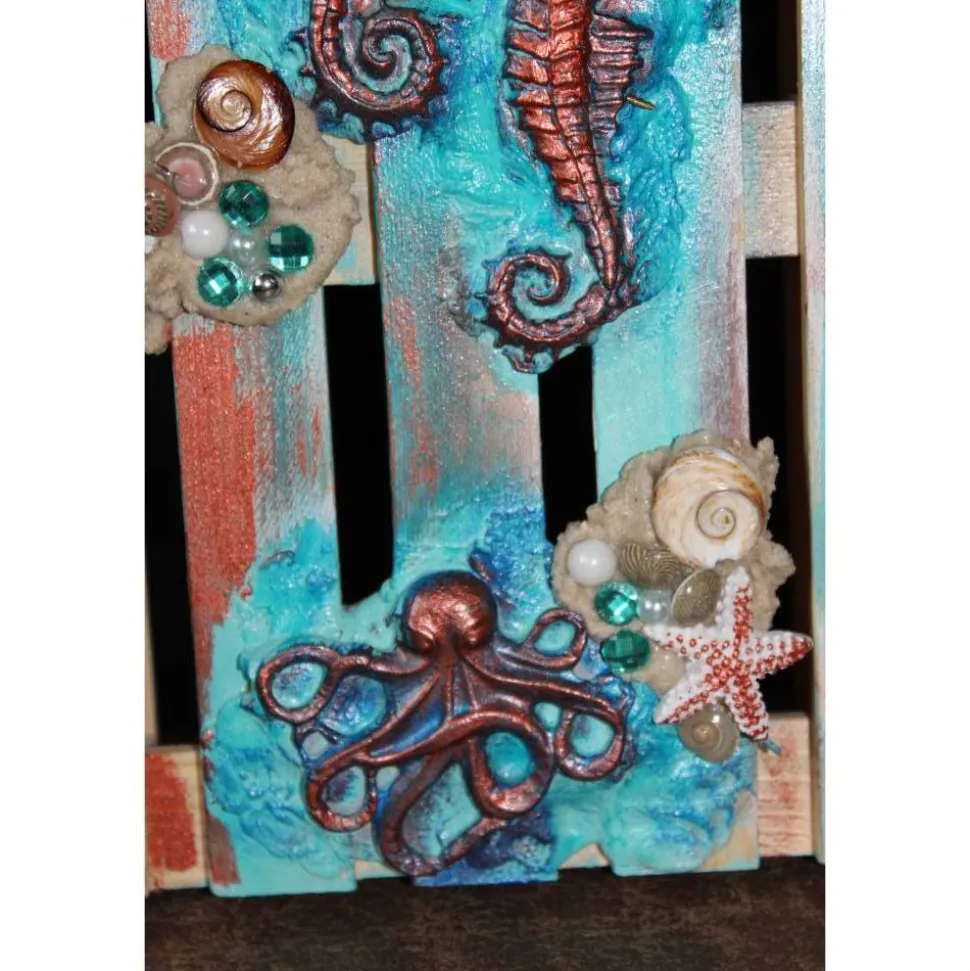 Acrylmalerei/Collage auf einer Mini-Dekopalette im maritimen Stil. Witzige Wohndeko, künstlerisch gestaltet mit Modelliermasse, maritimen Applikationen aus Polyresin, Glitzersteinen, Muscheln, Perlen und Sand. Wunderschöne strahlende Farben mit Gold- und Kupfereffekten verziert.