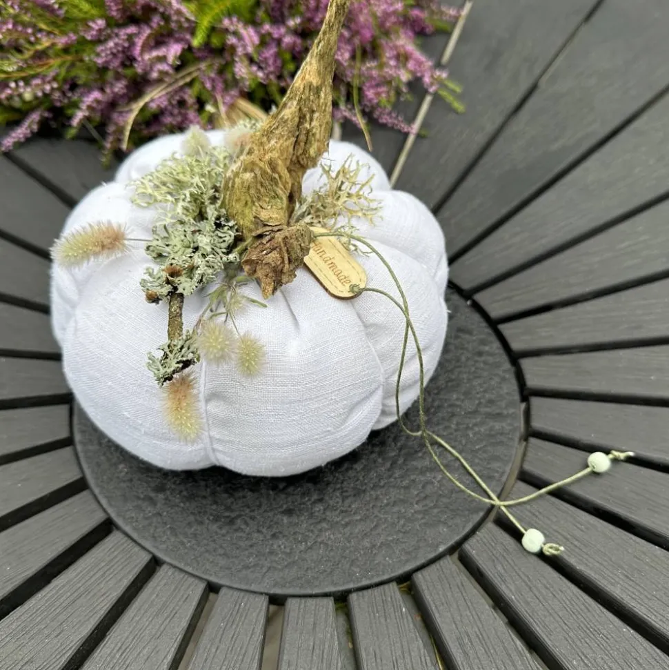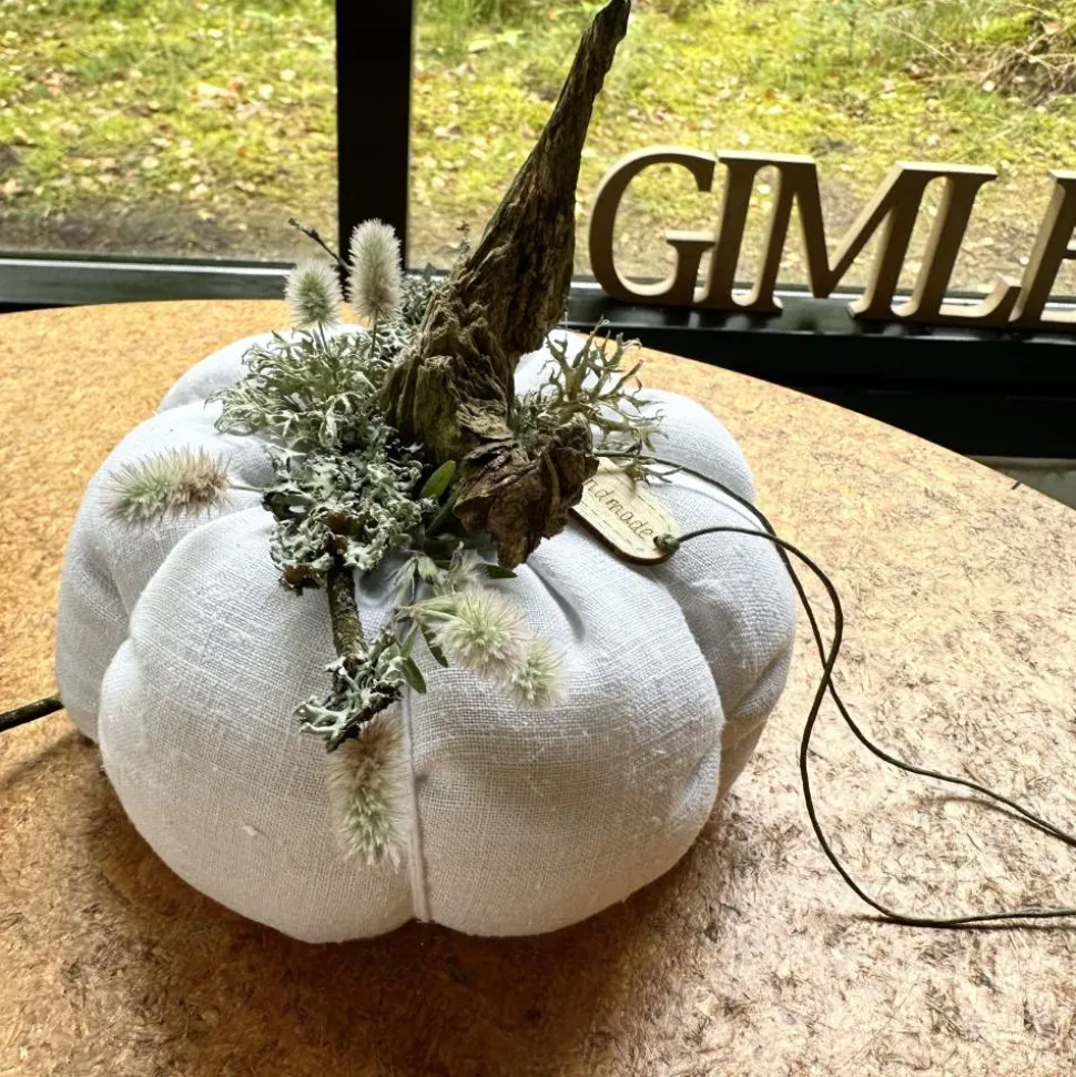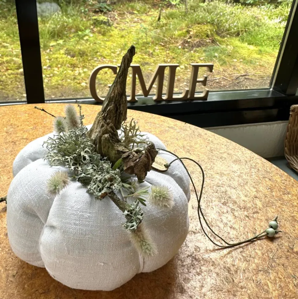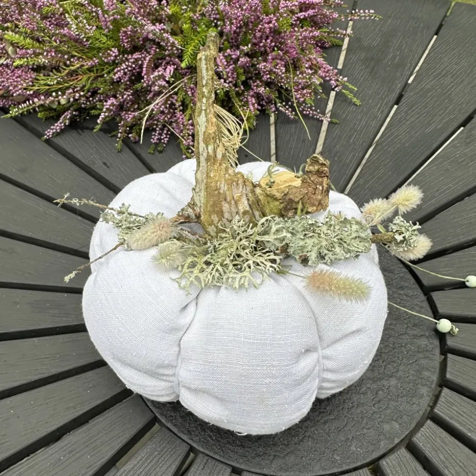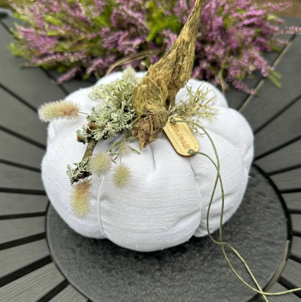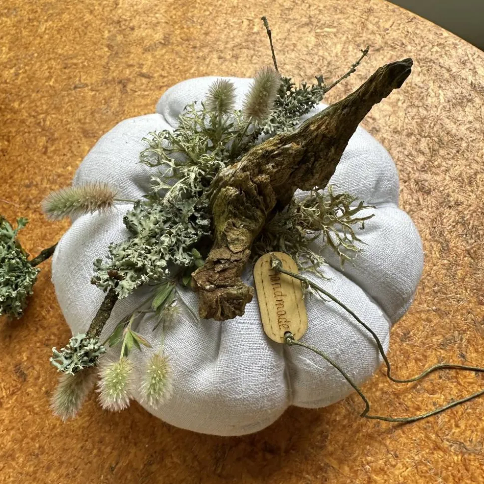 Verleihe deinem Zuhause eine herbstliche und zugleich skandinavische Note mit diesem einzigartigen Kürbis aus Leinen in XL. Jeder Deko-Kürbis wird handgefertigt und besticht durch sein exklusives Design in Rohweiß, Beige und Farmgrün. Die Kombination aus feingewebtem, blickdichtem Leinen und natürlichen Akzenten wie Treibholz, luftgetrocknetem Seegras, Staubenblumen, Kronstaube und Birken Moos macht jedes Stück zu einem echten Unikat.