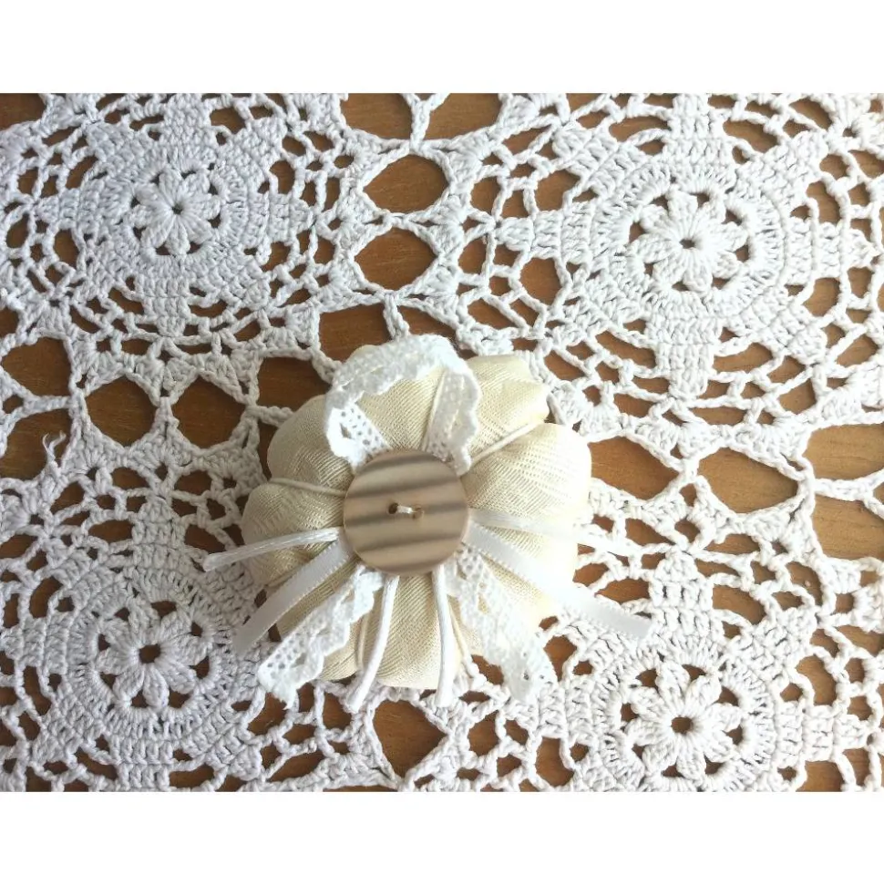 Der Kürbis ist aus einem cremefarbigen Baumwoll-Brokatstoff genäht. Dekoriert ist der Kürbis mit einem hellbraunen Knopf, der mit einer weißen Baumwollspitzenborte, einer cremefarbenen Satinkordel und einem weißen Satinband verziert ist. Gefüllt ist der Stoff-Kürbis mit Bastelwatte.