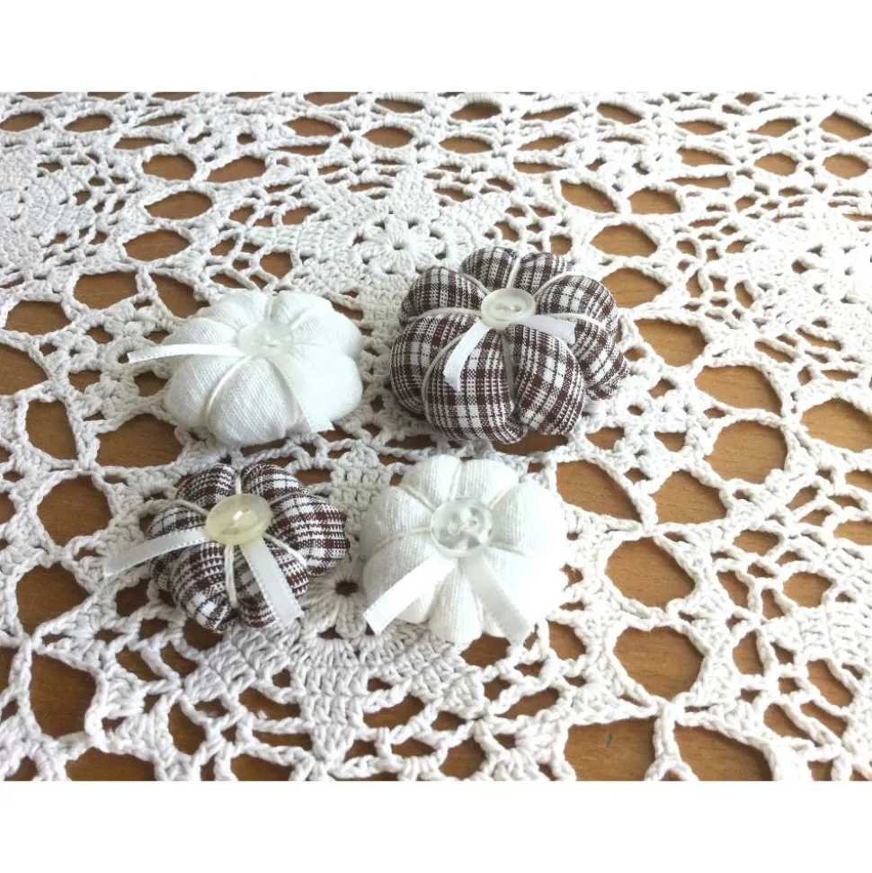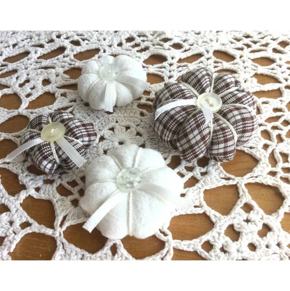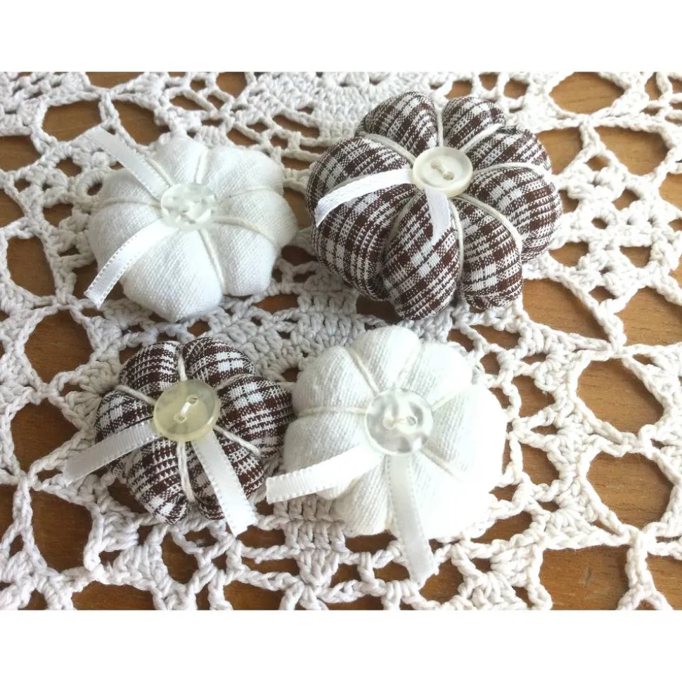 Die Kürbisse sind unterschiedlich groß. Zwei sind aus einem braun-beige-karierten Baumwollstoff und die anderen beiden habe ich aus einem cremefarbigen Baumwollstoff genäht. Verziert sind die Kürbisse mit je einem kleinen weißen Knopf und einem weißen Satinband. Gefüllt sind die Stoff-Kürbisse mit Bastelwatte.