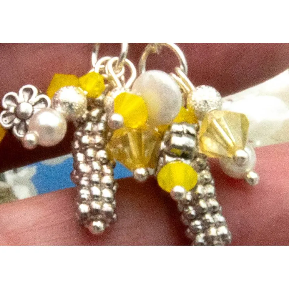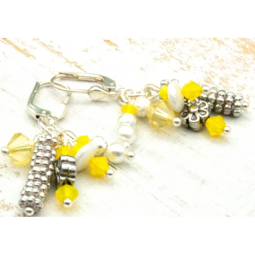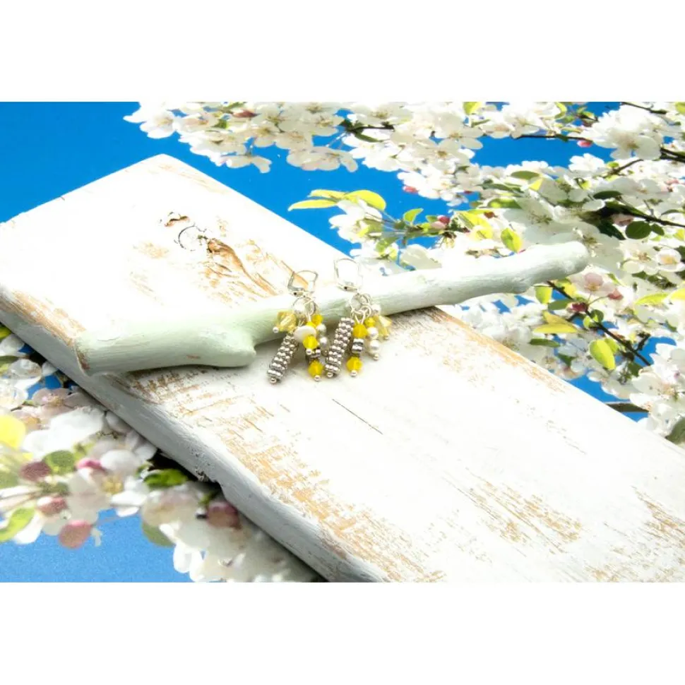 Verleihe deinem Look einen funkelnden Touch mit diesen leichten Ohrhängern aus gelben Glasschliffperlen, Kunststoffelementen und silberfarbenen Metallelementen. Genieße das angenehme Tragegefühl dank der 925er Silber Brisur und ziehe mit dem einzigartigen Bohemian-Design alle Blicke auf dich.