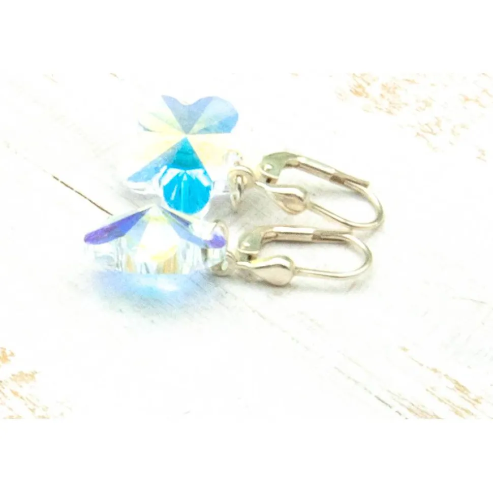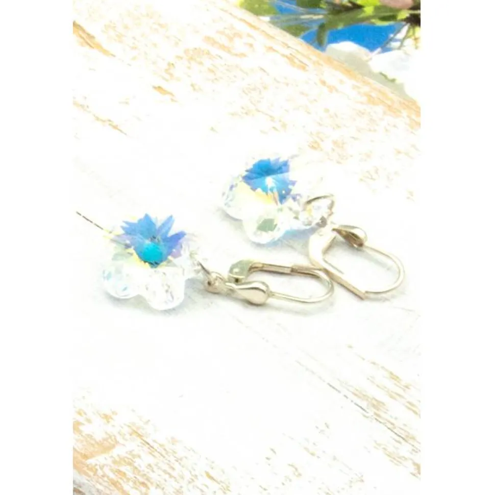 Diese leichten Ohrhänger sind mit kleinen runden irisierenden Glasschliffanhängern in Crystal und Silberfarben gefertigt. Die Länge der Ohrhänger beträgt ca.: 3,1 cm, das Gewicht pro Ohrhänger ca.: 1,9 Gramm