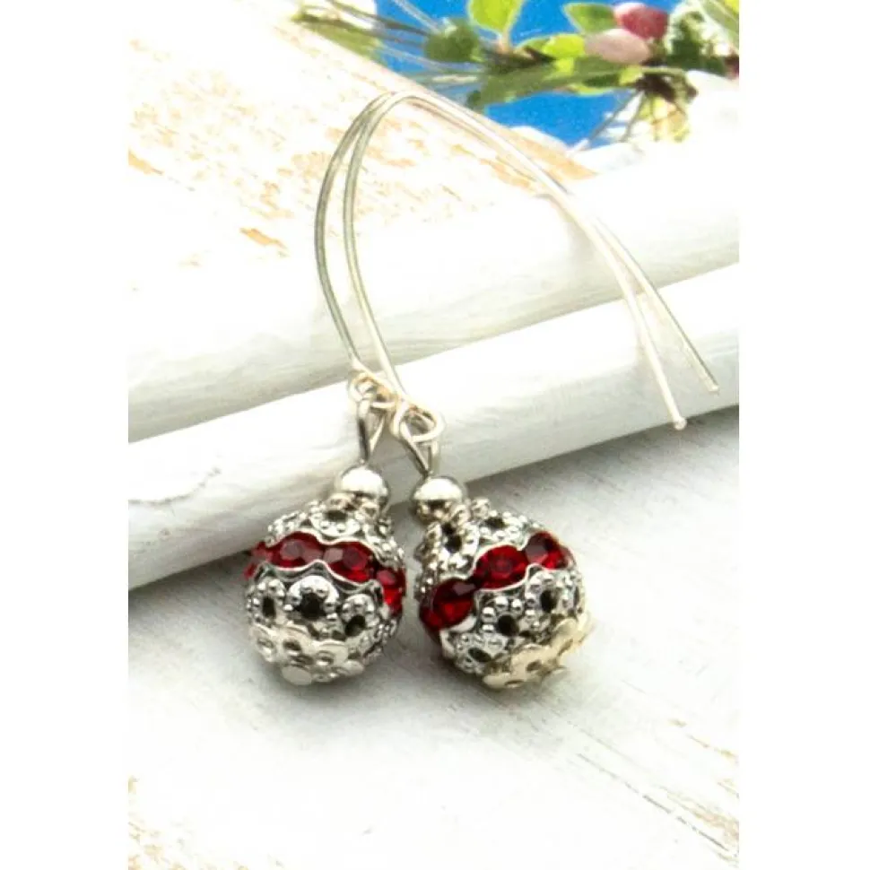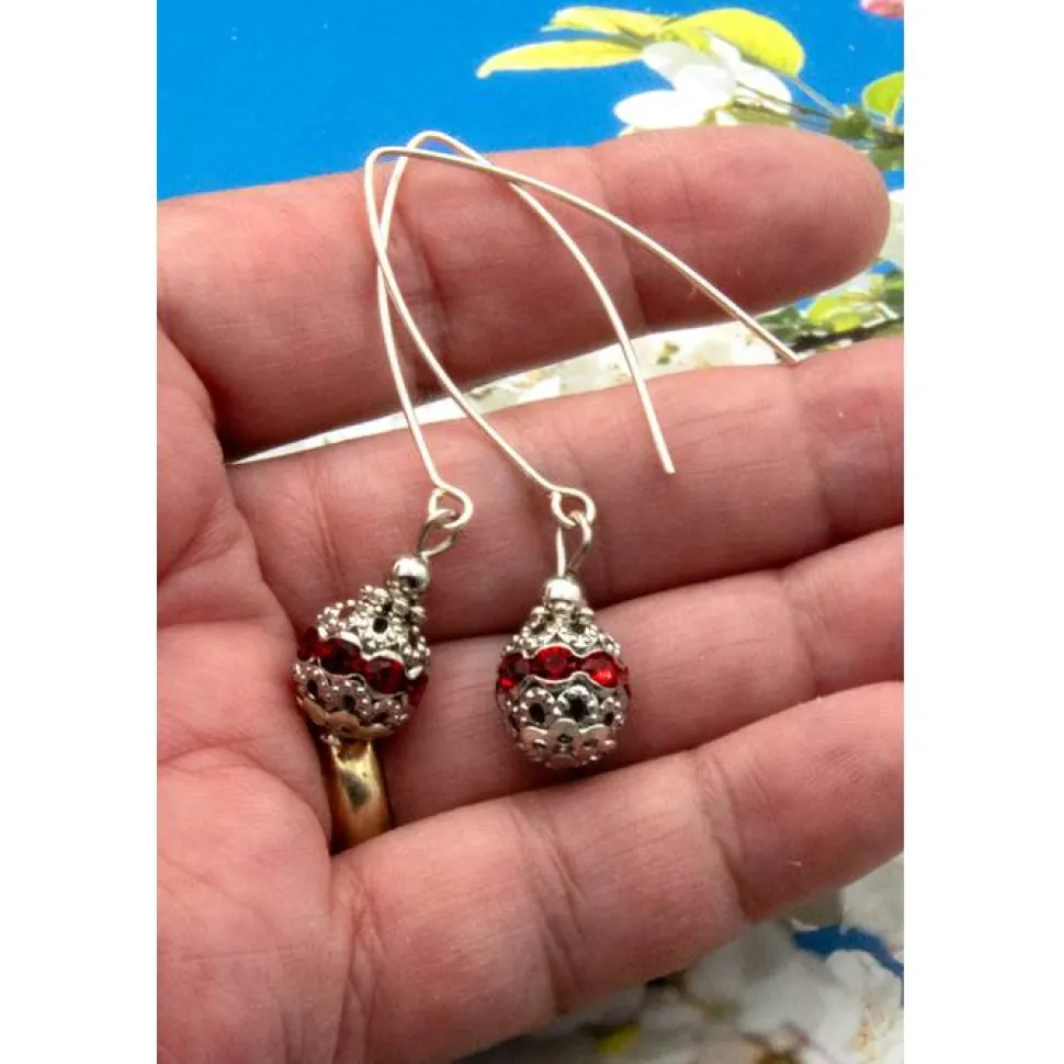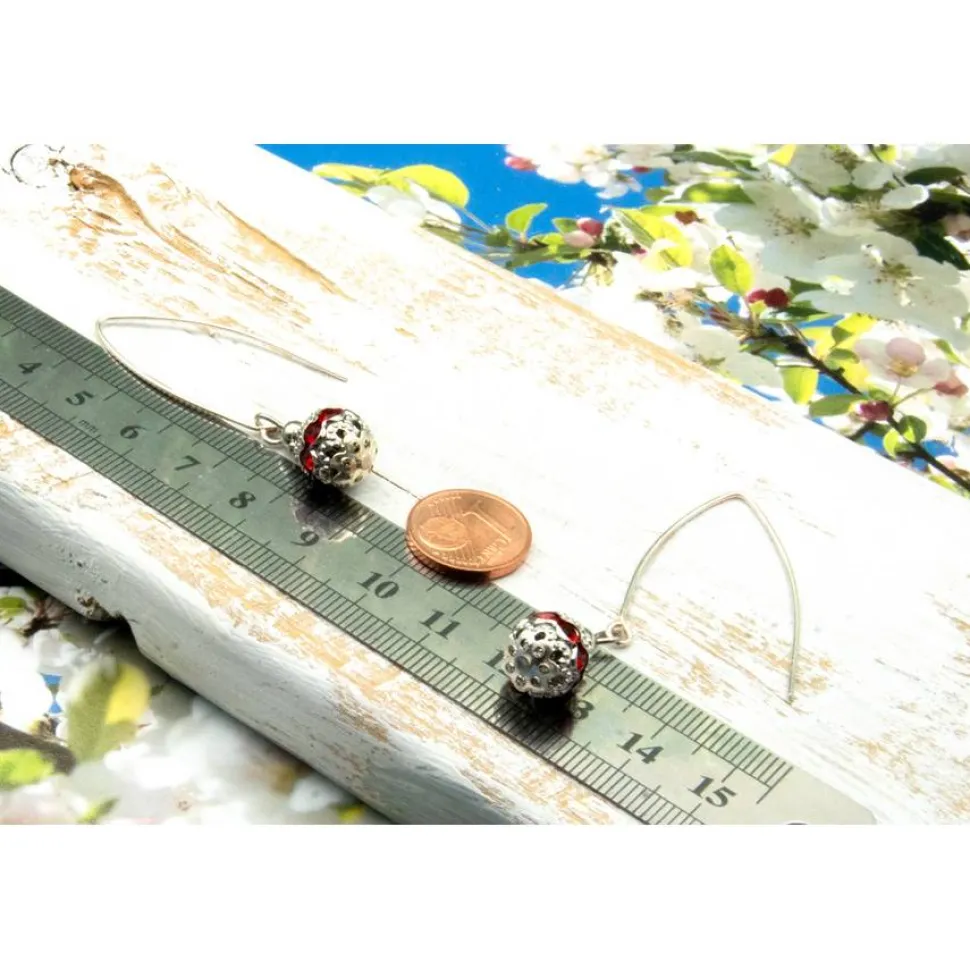 Diese langen, leichten Ohrhänger sind mit Metallanhängern, Silber und Glas in Rot und Silberfarben gefertigt. Die Länge der Ohrhänger beträgt ca.: 5,4 cm, das Gewicht pro Ohrhänger ca.: 1,5 Gramm.