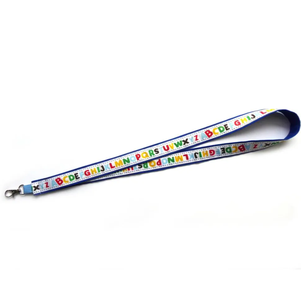 aus Baumwollstoff in blau mit einem aufgenähten Webband in weiß mit dem gesamten ABC in bunten Farben.
