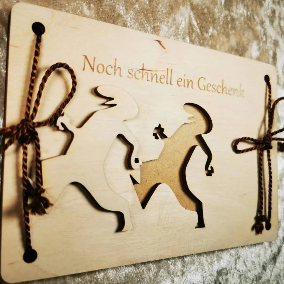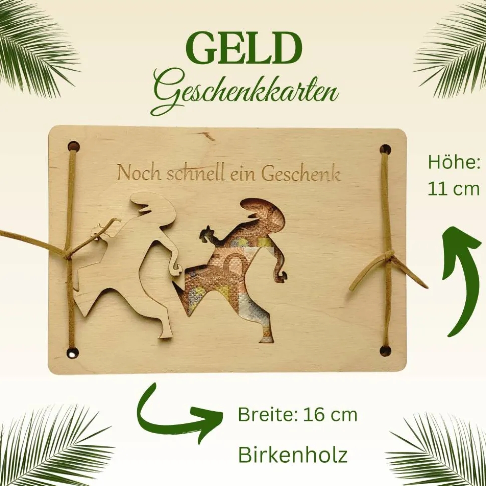 Die Geldgeschenkkarte wird am PC entworfen und mit einer Lasergravur erstellt und in Handarbeit nachgearbeitet. Auf Wunsch personalisieren wir die Holzkarte per Lasergravur mit einem Namen, um eine persönliche Note hinzuzufügen.