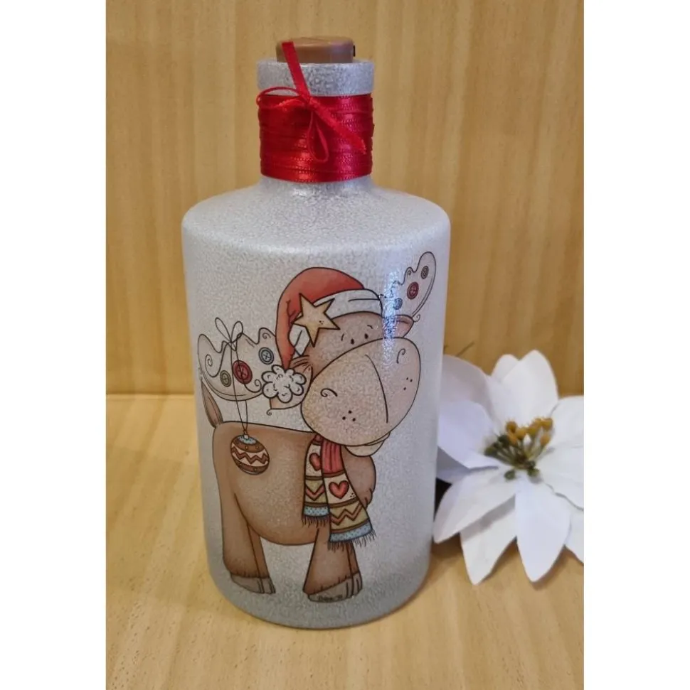 Die Flasche ist in zwei Schritten mit einer Satinierfarbe grundiert. Nach Auswahl des Motivs wird dieses auf Wasserschiebefolie gedruckt und versiegelt. Nachdem trocknen wird das Motiv auf die Flasche gebracht. Im Anschluss wird farblich passendes Satinband um den Flaschenhals gewickelt und der Korken mit den LED´s angebraucht.