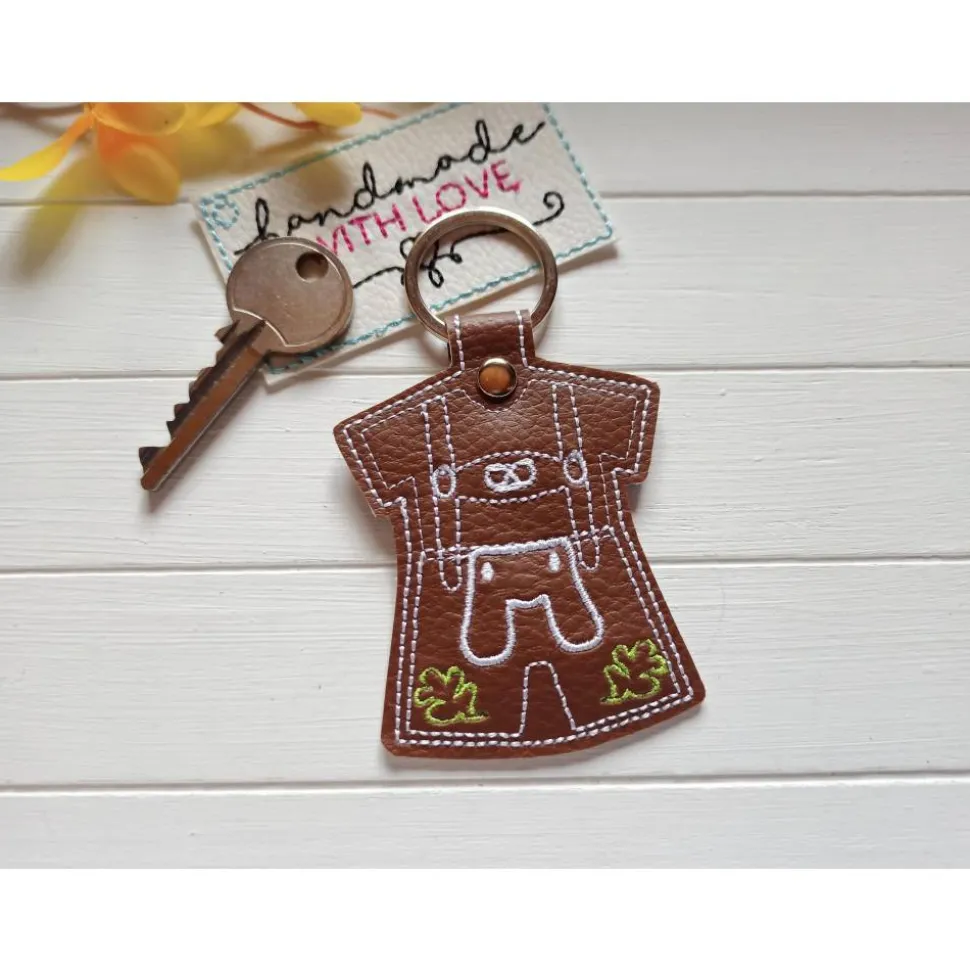 Entdecke den einzigartigen Lederhose Schlüsselanhänger, kunstvoll gestickt auf braunem Kunstleder!