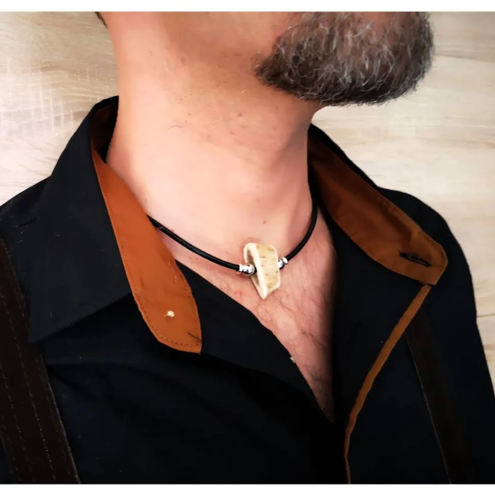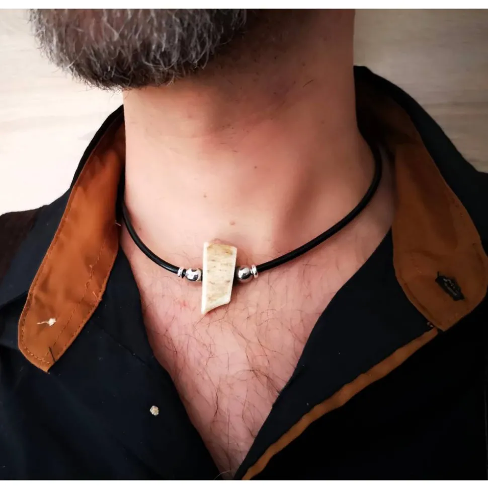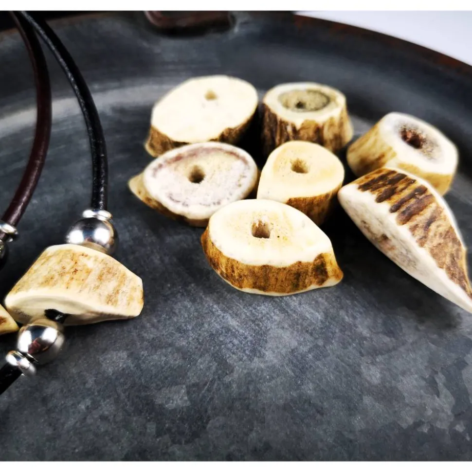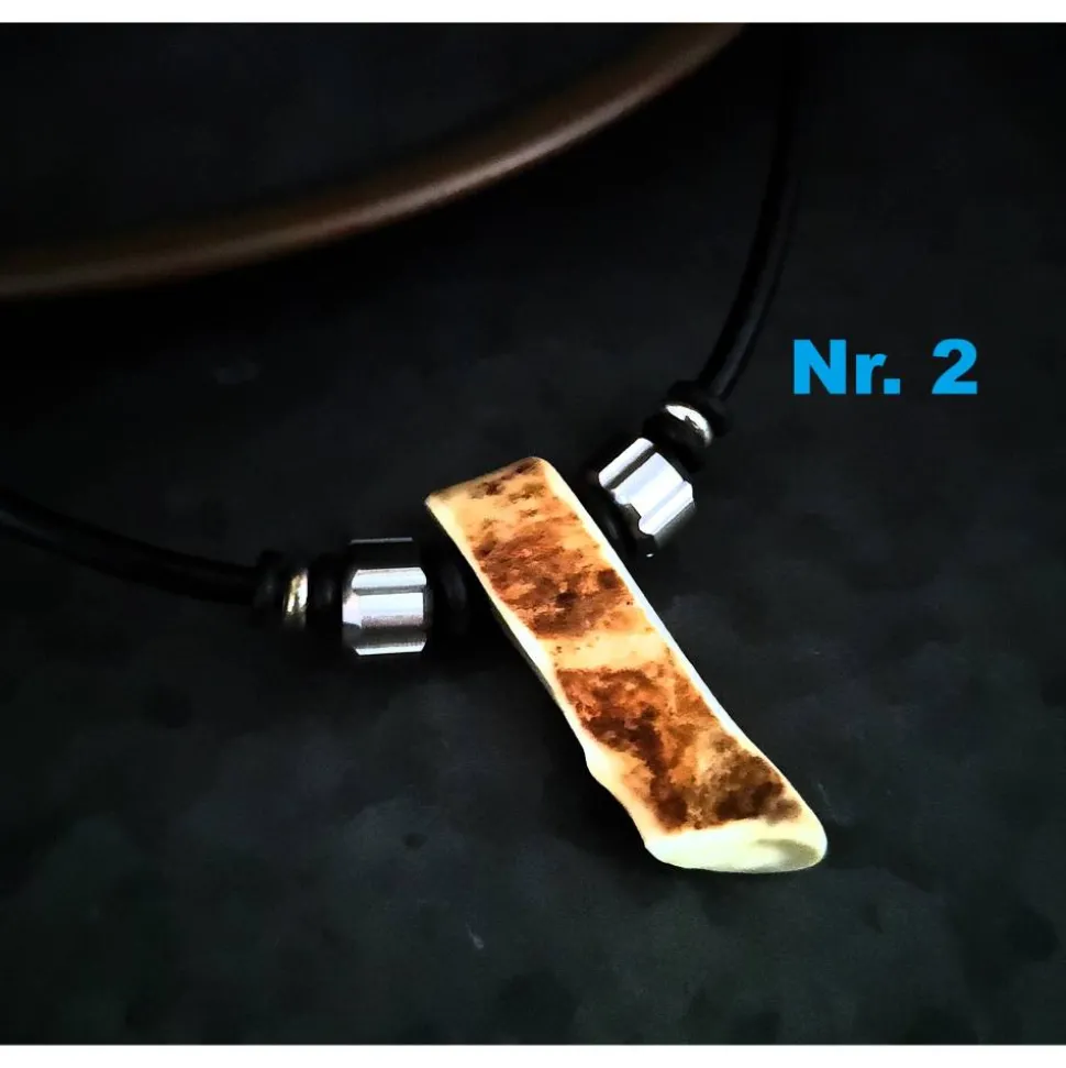 Hergestellt aus glattem Rindsleder und veredelt mit Edelstahlkugeln und einem Hornanhänger in verschiedenen Designs – sei es ein schlankes, längliches Horn, eine kleine Hornperle oder eine auffällige Hornperle.