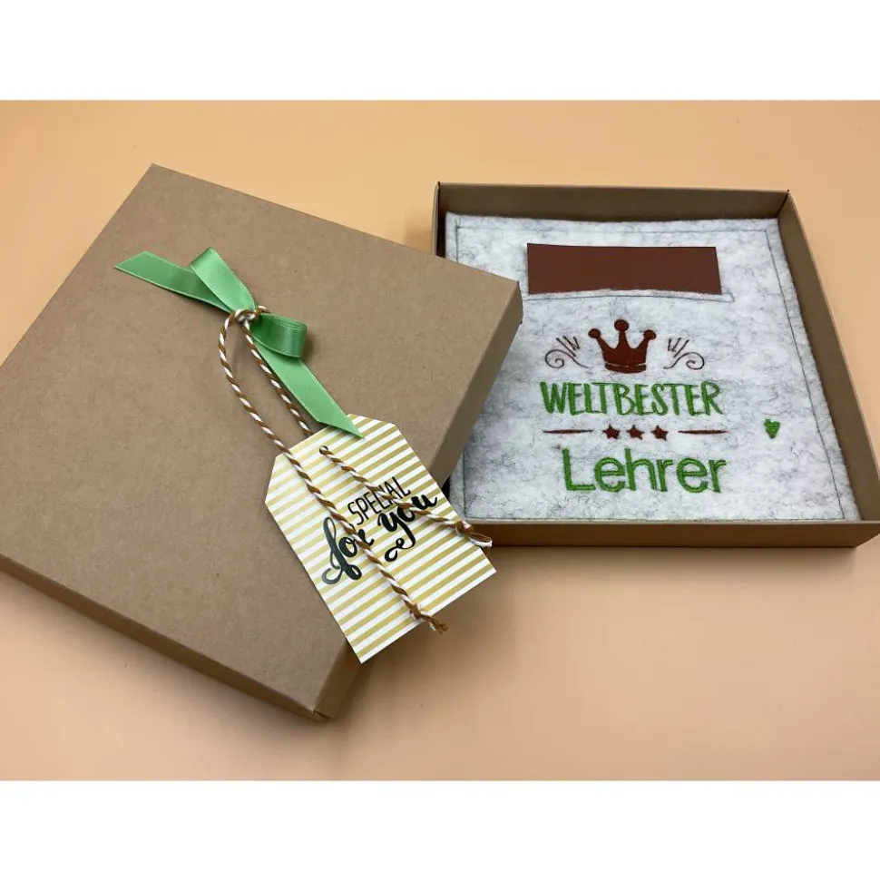 Eine farblich passende Schleife und ein Anhänger, welcher auch beschriftet werden kann ziert die Box Außenseite….