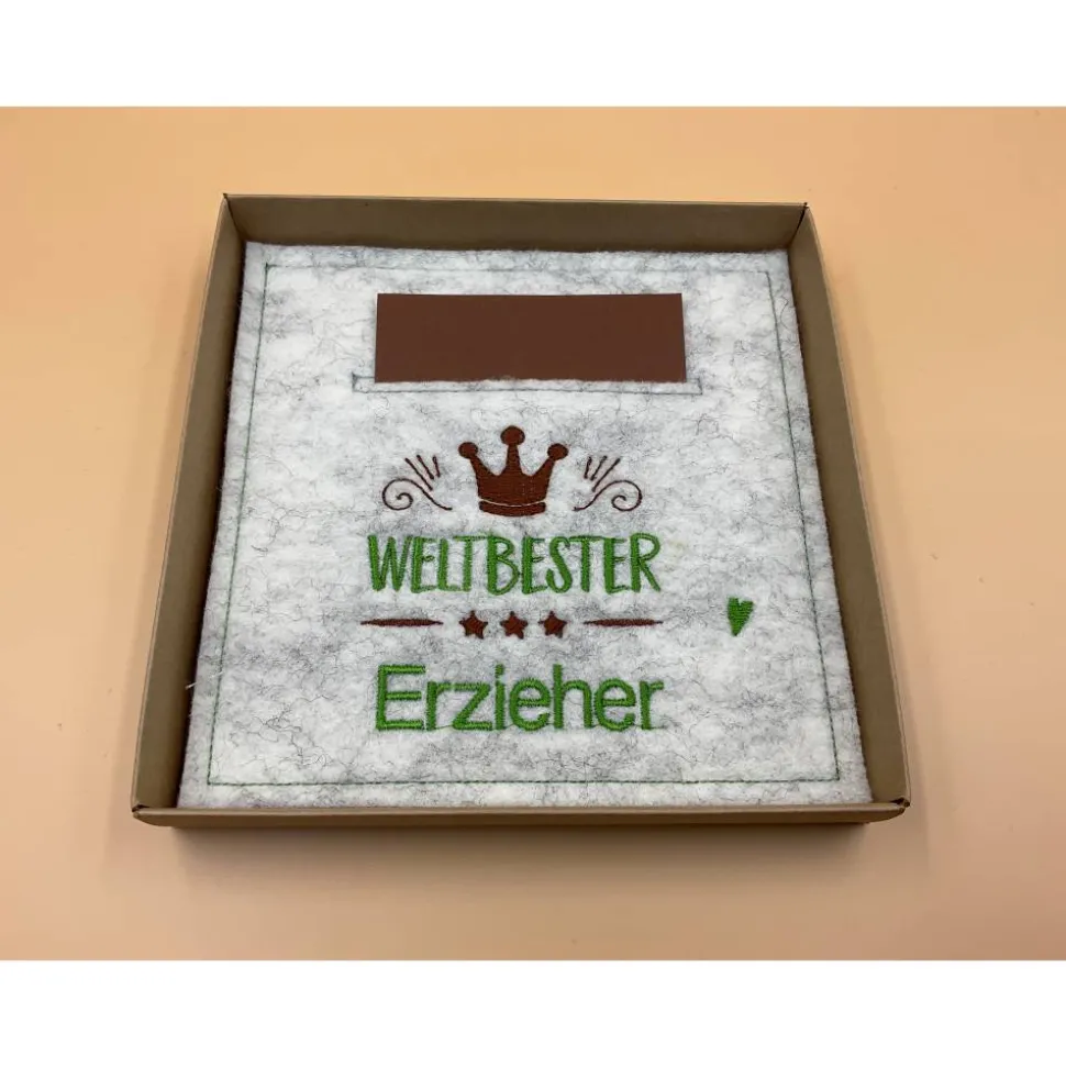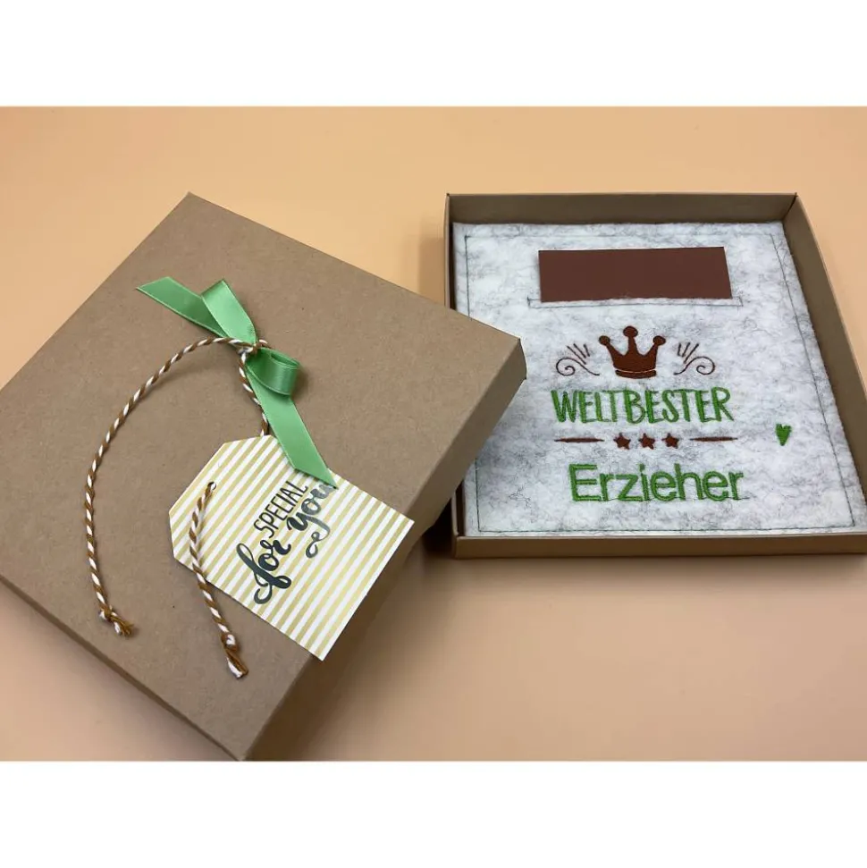 Im Inneren eine bestickte Filzkarte mit Einschub für Geld oder eine Botschaft, oder Beides!