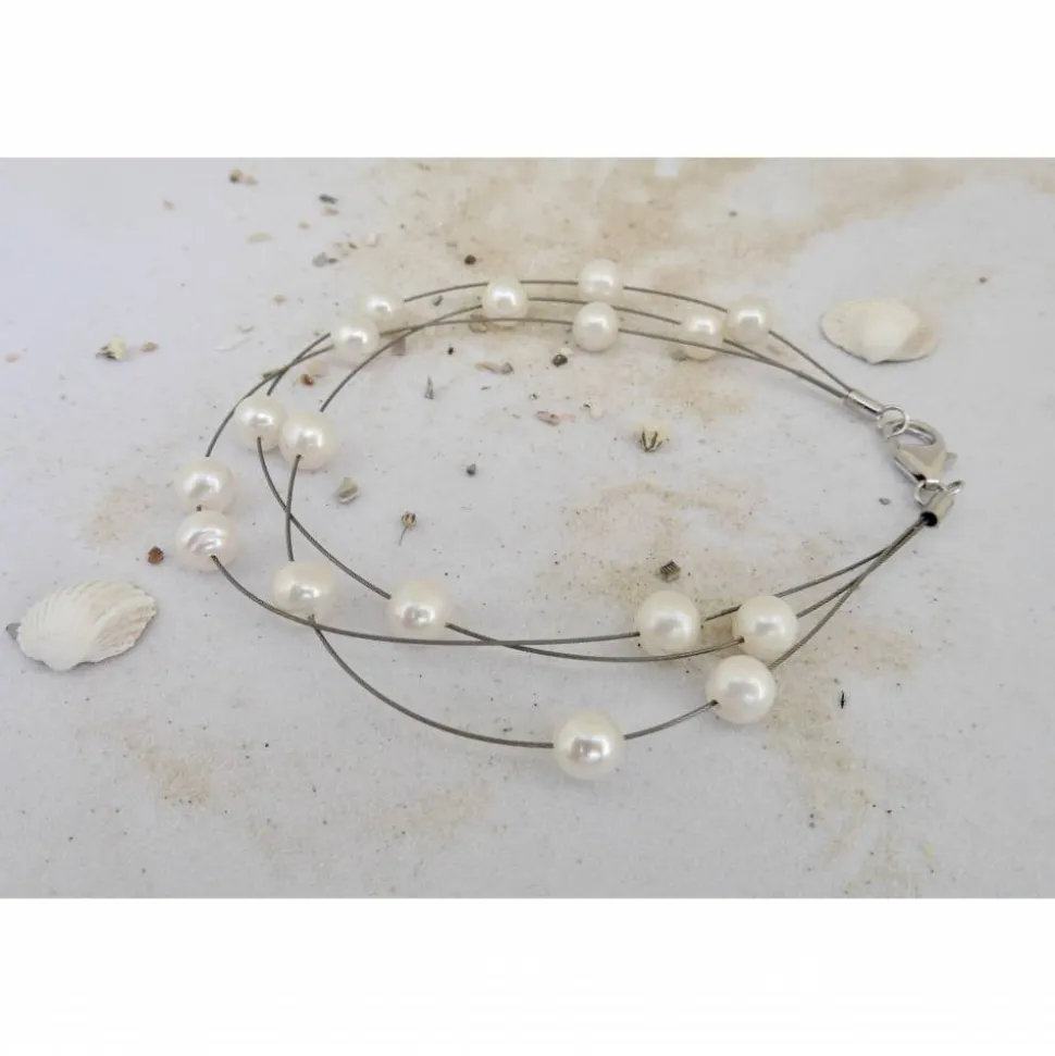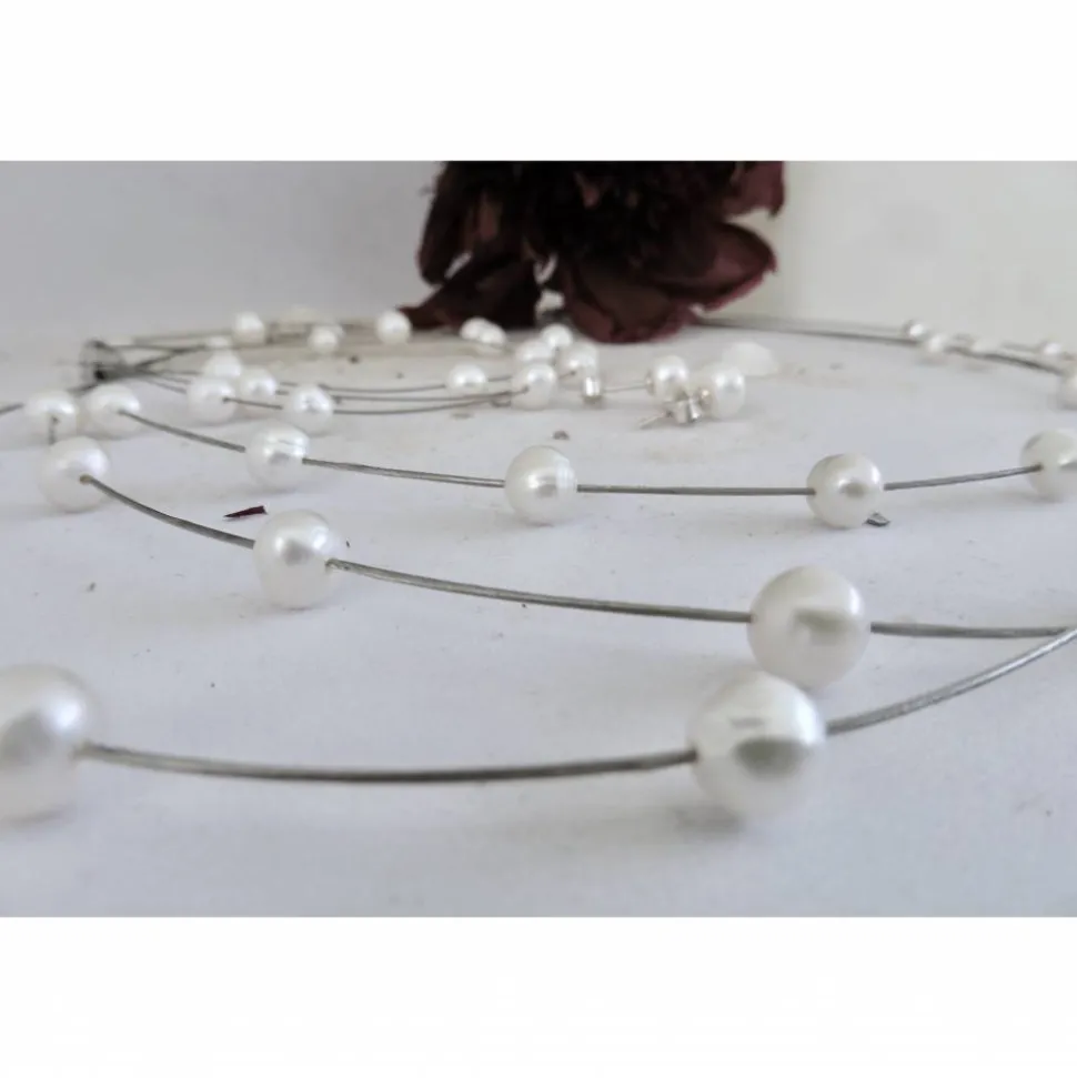 Die Perlenkette besteht aus 3 Reihen schwebender runder weisser Perlen 6-7 mm auf ummanteltem Juwelierdraht mit silbernem Schloß (925er Sterling Silber) mit kleinem Verlängerungskettchen. Die Länge des engsten Strangs ist ca. 44 cm, die anderen liegen angezogen knapp darunter. Bitte geben Sie die gewünschte Länge des kleinsten Stranges angeben, wenn sie anders werden sollte. Die Perlen auf der Kette und dem Armband sind mit Kleber fixiert. Sollte sich mal eine Perle lösen, kann sie leicht wieder mit einem winzigen Tropfen Sekundenkleber fixiert werden.