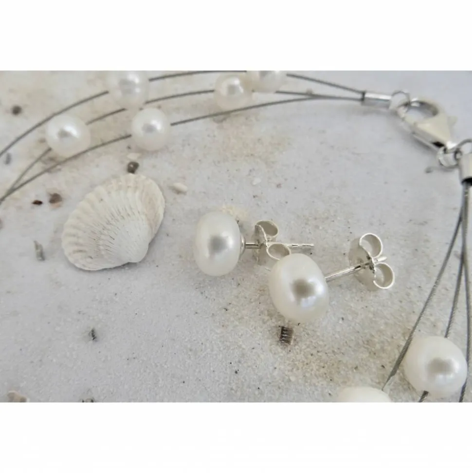 Die Perlen der Ohrstecker sind 6-7 mm im Durchmesser in leicht gedrückter Buttonform und mit einer Sterling silbernen Montur.