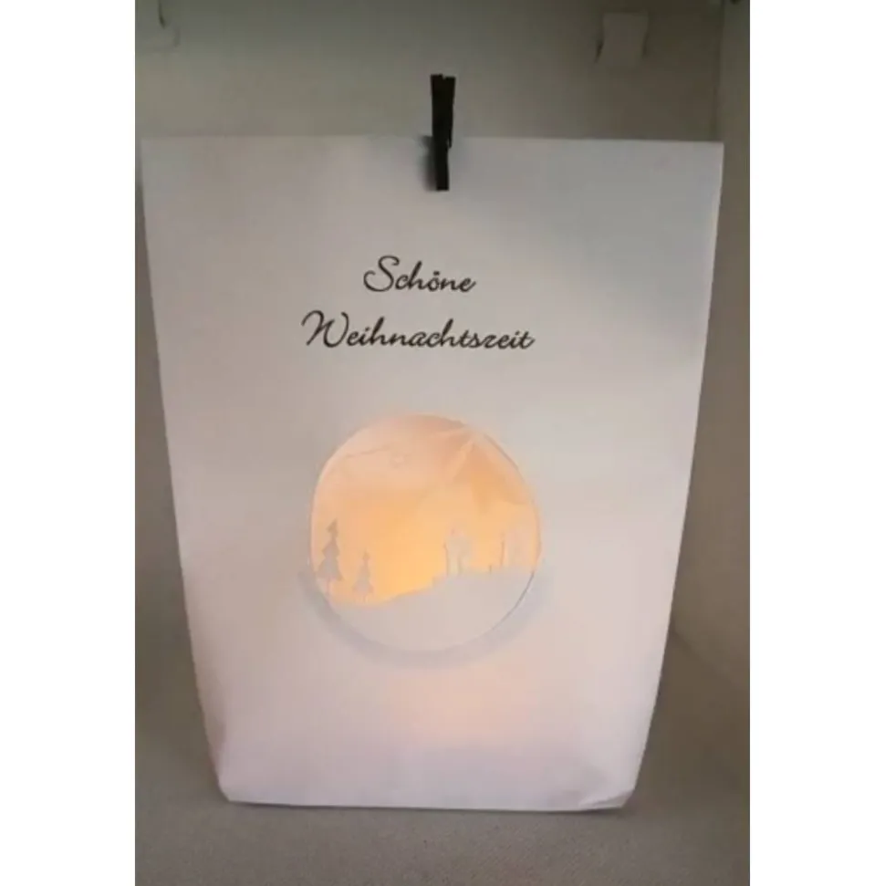 In der Tüte befindet sich wahlweise ein elektrisches Teelicht mit Batterie oder eine 10 er LED Lichterkette incl. 2 Knopfzellen.. Somit ist die Tüte direkt einsatzbereit.