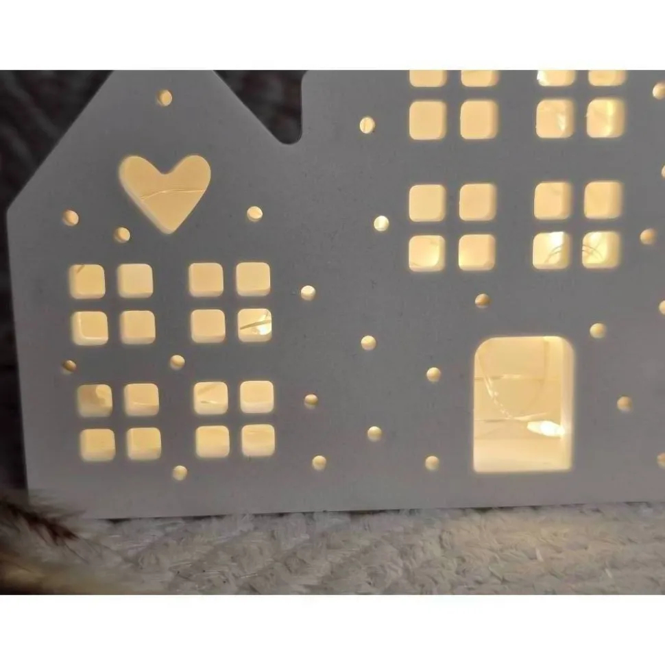 Das Lichterhaus misst 19 cm in der Länge, 10 cm in der Höhe und 2,5 cm in der Breite. Im Lieferumfang ist eine batteriebetriebene LED-Lichterkette (ohne Batterien) enthalten – einschalten und wohlfühlen!