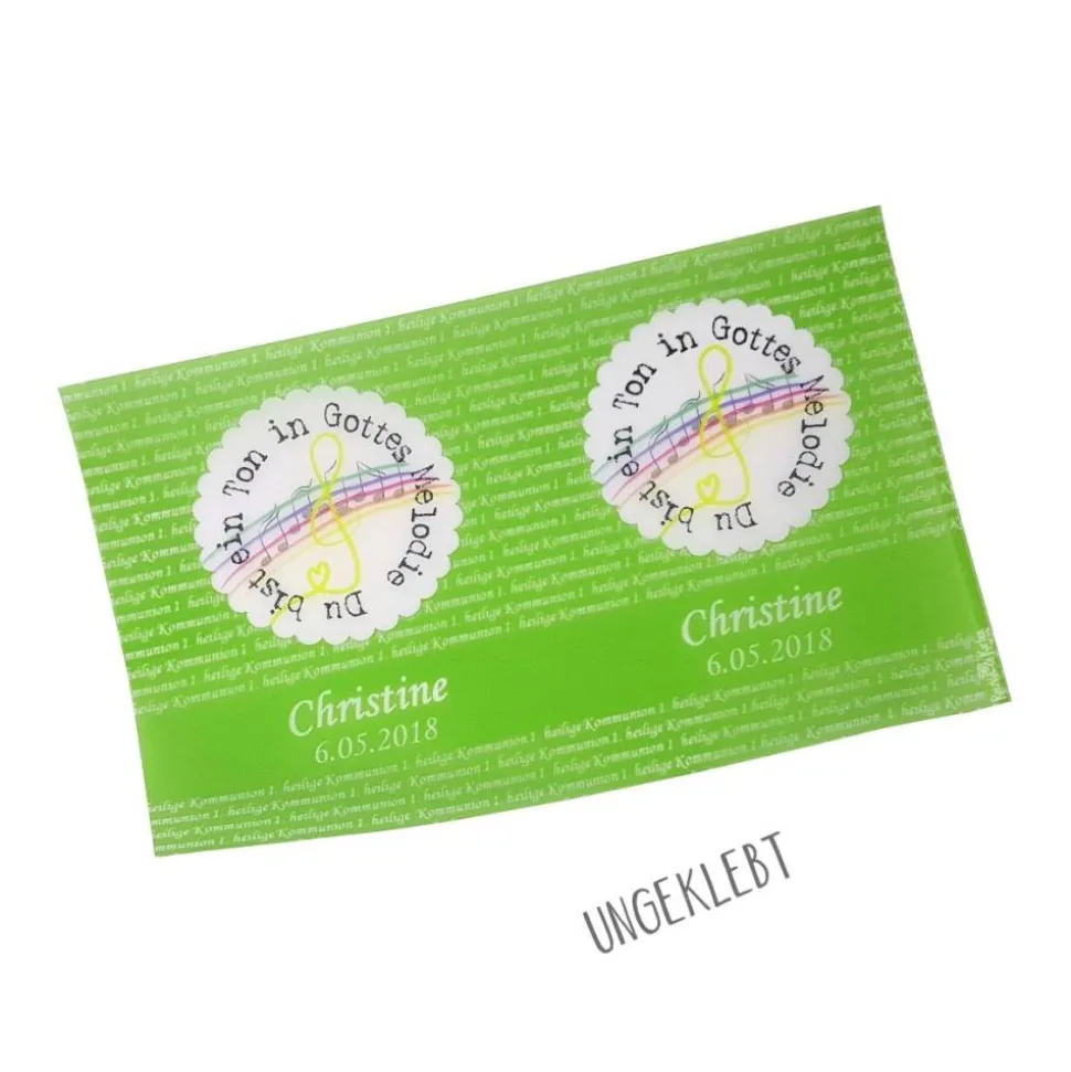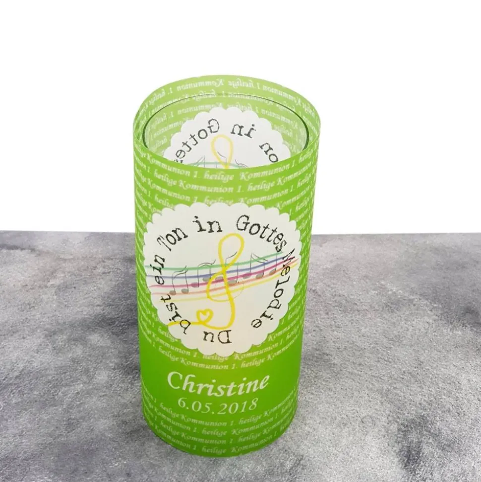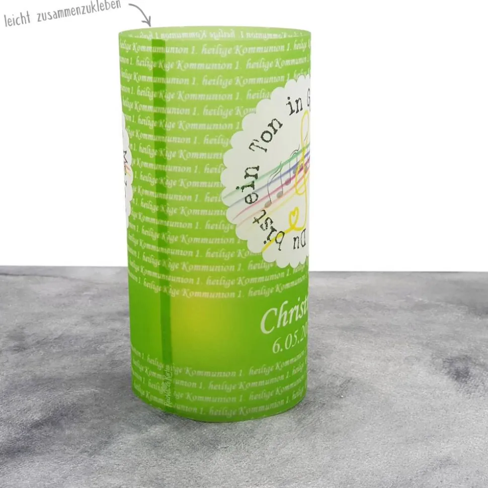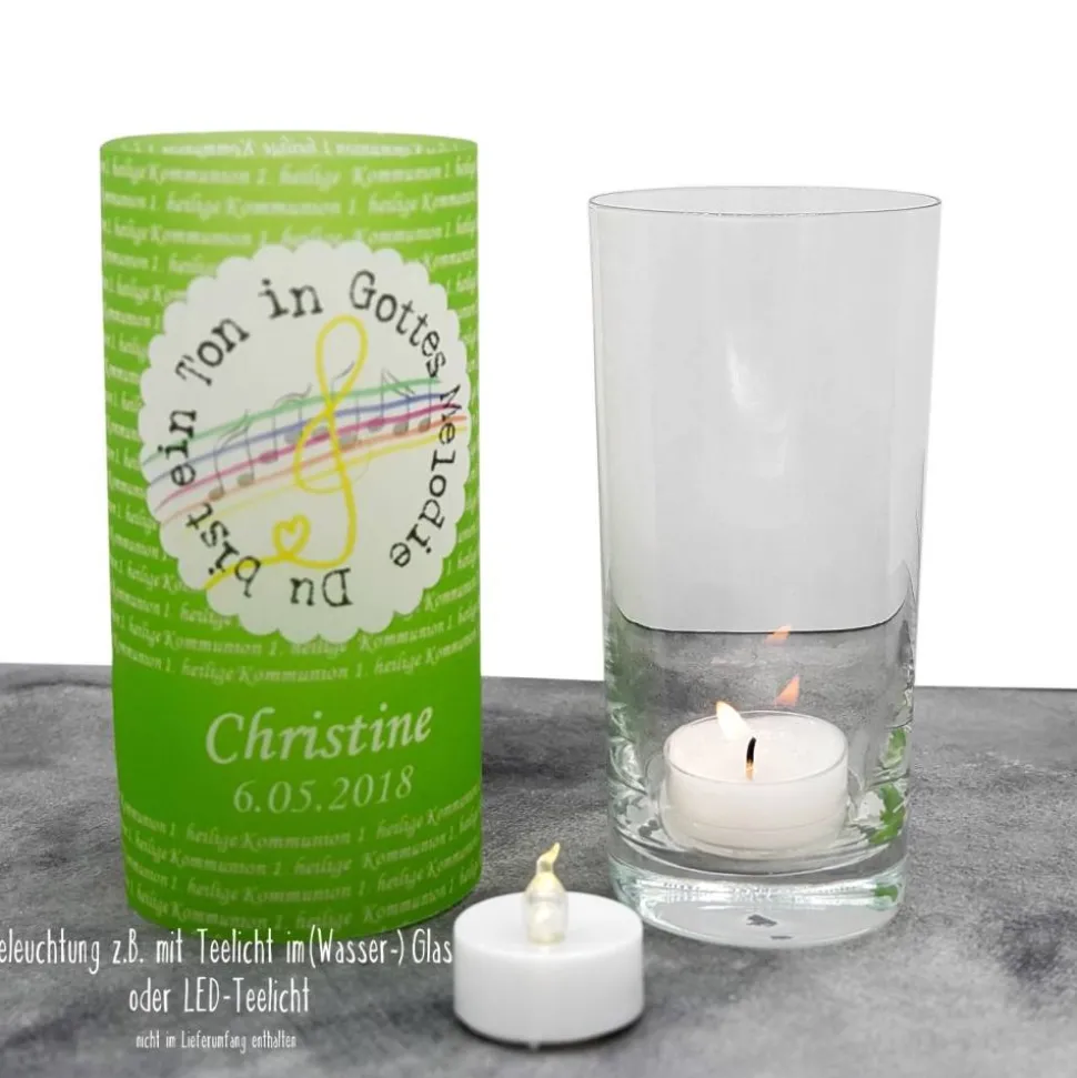 Gestalte deine Kommunionfeier mit einer einzigartigen Lichthülle aus Transparentpapier, bedruckt mit dem Motto „Du bist ein Ton in Gottes Melodie“!