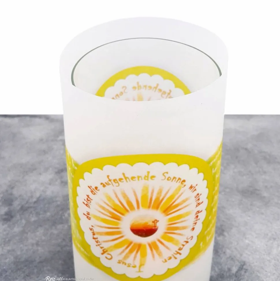 Diese hochwertige Lichthülle aus Transparentpapier passt ideal zum Motto: „Jesus Christus, du bist die aufgehende Sonne, wir sind deine Strahlen“. Auf Wunsch kannst du das Motto individuell anpassen lassen – kontaktiere mich einfach dafür!