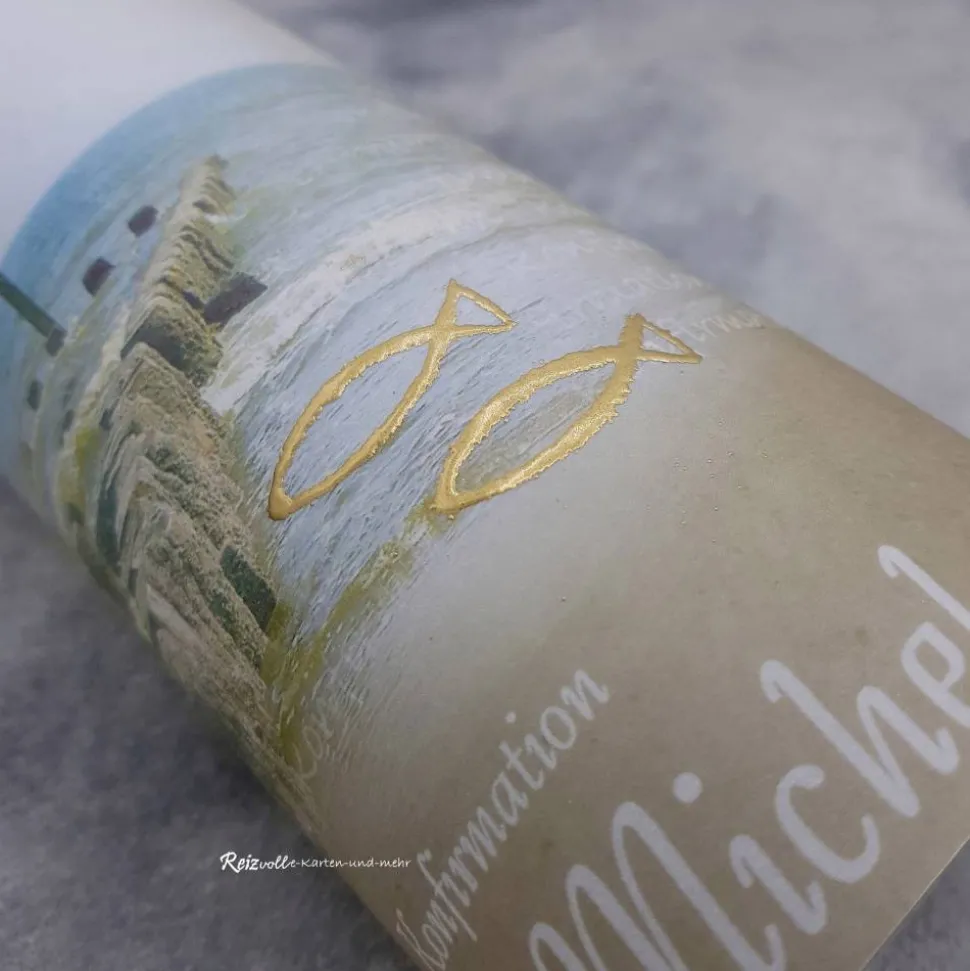 Diese einzigartige Lichthülle ist perfekt als Tischdeko zur Konfirmation, Kommunion oder Firmung. Sie wird auf hochwertigem Transparentpapier gedruckt und anschließend fixiert – so ist der Druck wasser- und lichtbeständig. Die edlen Fische werden im Heißembossing-Verfahren in Gold gefertigt und sorgen für einen stilvollen Akzent.