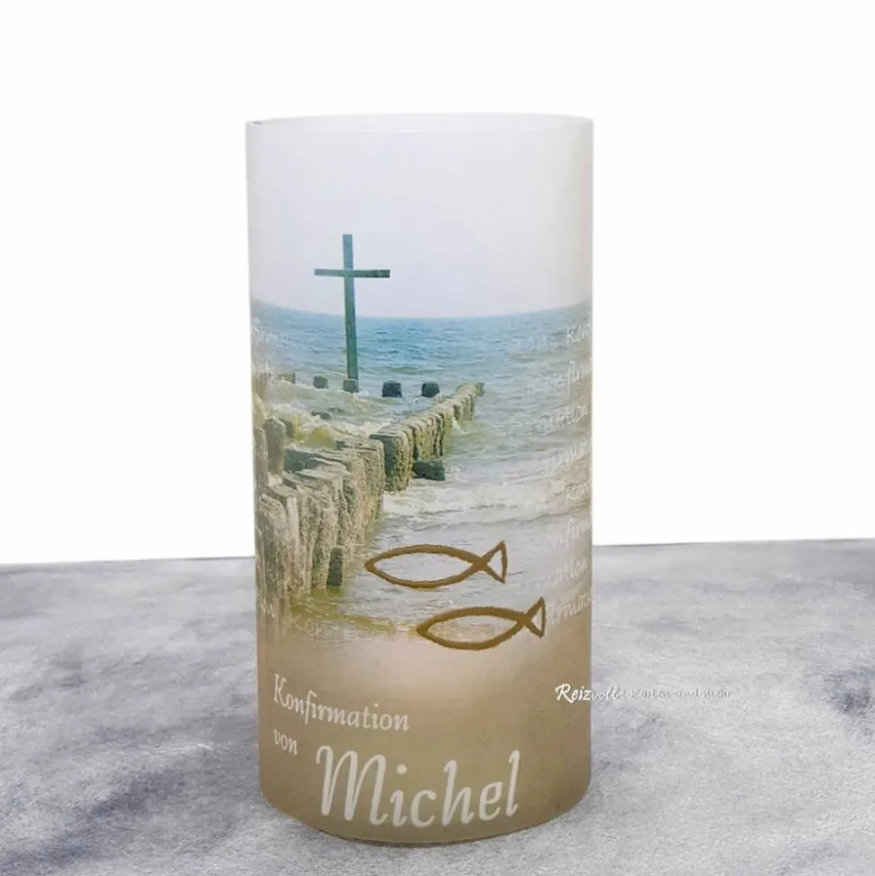 Gestalte deine Feier besonders: Die Lichthülle „Kreuz im Meer“ aus Transparentpapier wird individuell mit deinem Wunsch-Spruch bedruckt!