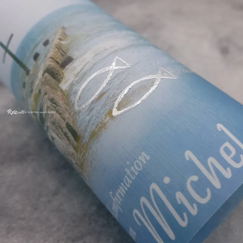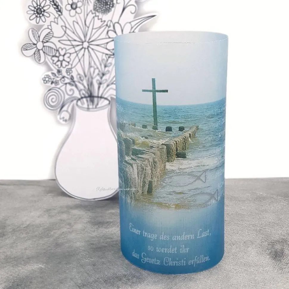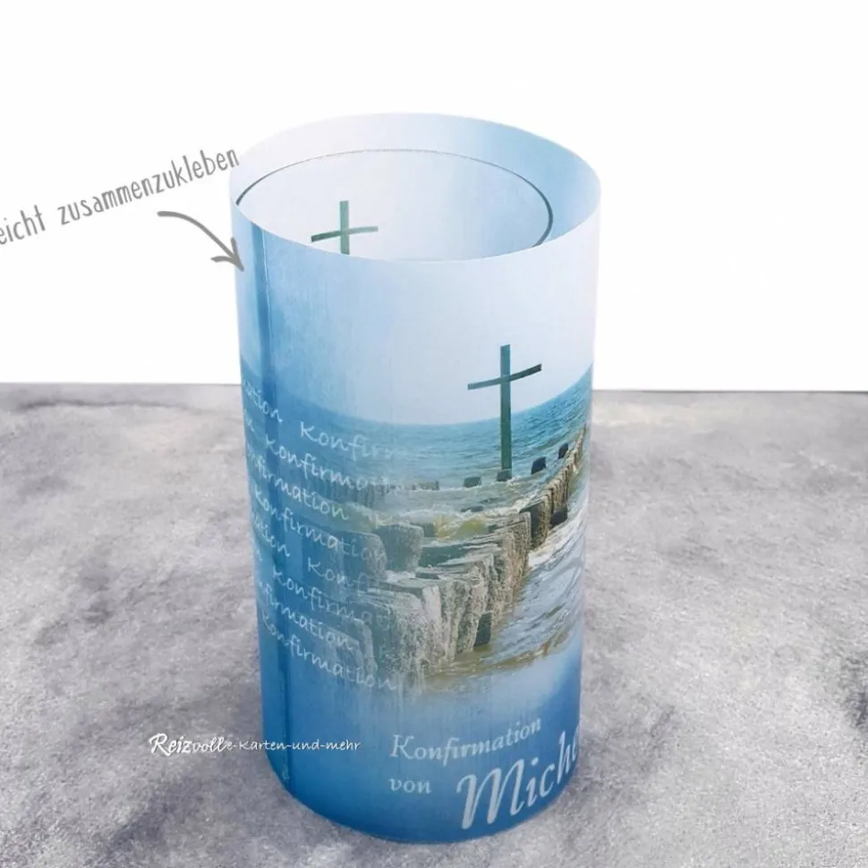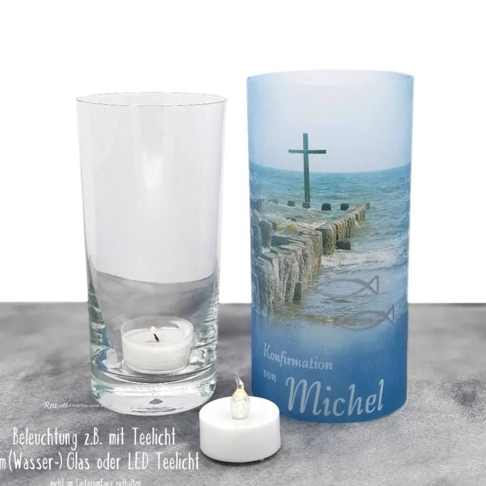 Entdecke die einzigartige Lichthülle aus Transparentpapier für Konfirmation, Kommunion oder Firmung im Design „Kreuz im Meer“.