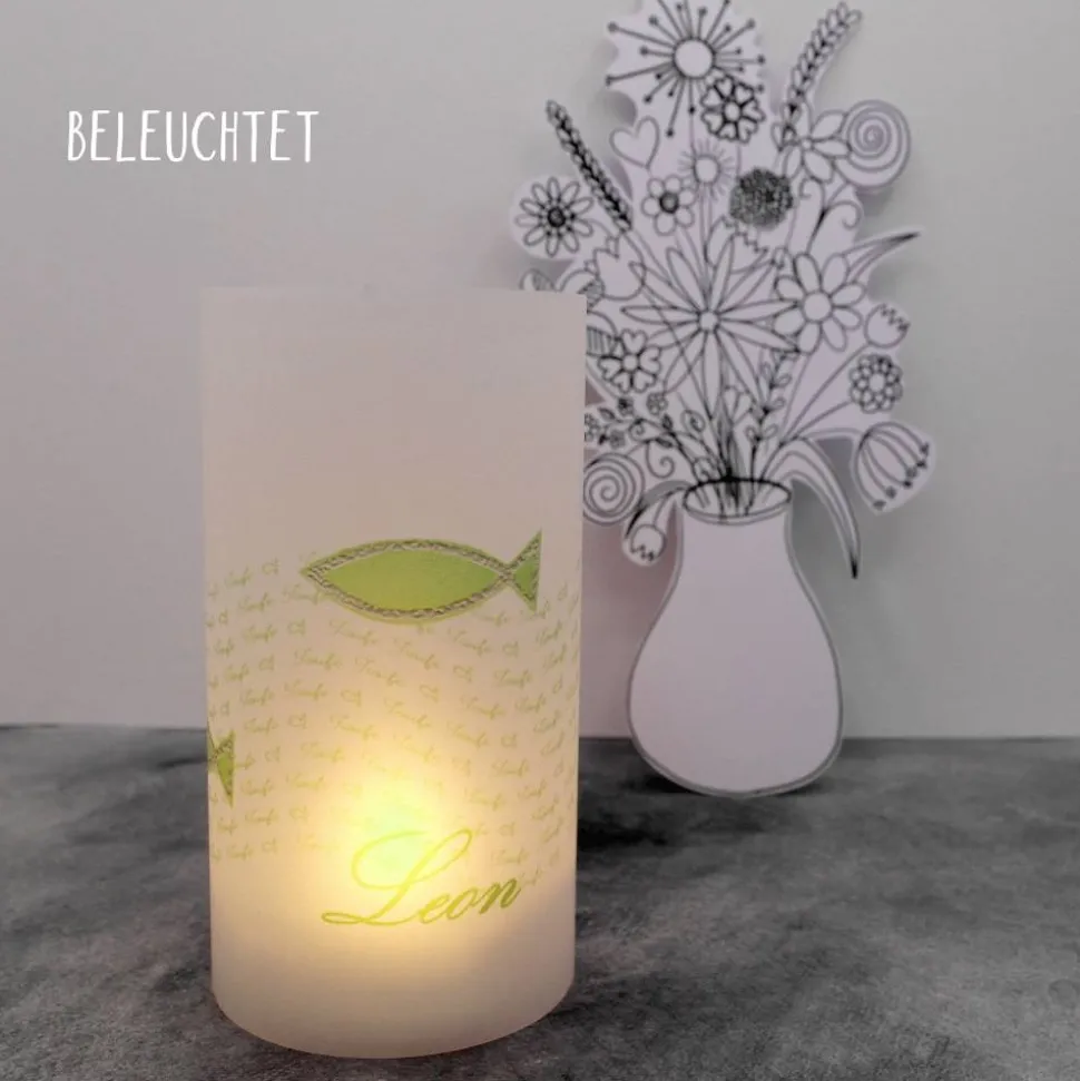 Die Lichthülle zur Taufe mit bunte Fischen ist aus Transparentpapier gefertigt und zum einfachen Zusammenkleben vorbereitet. Die bunten Fische sind direkt aufgedruckt.