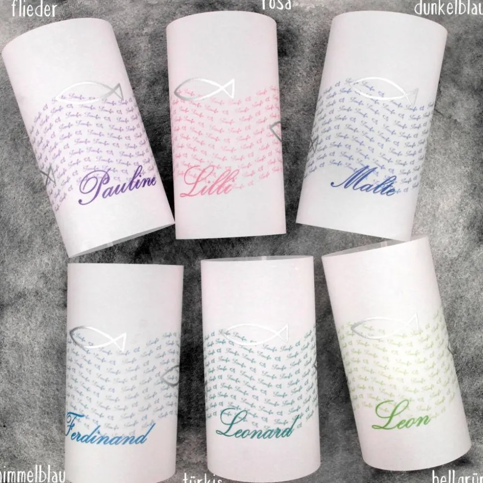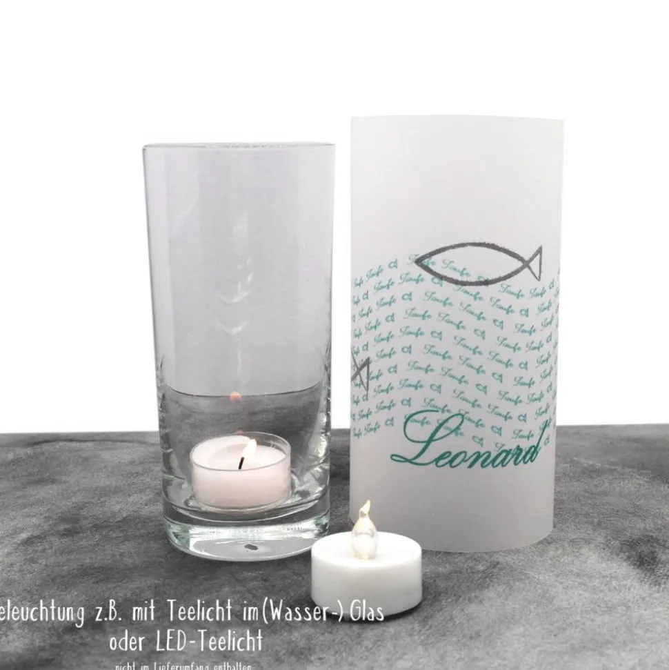 Entdecke die einzigartige Lichthülle zur Taufe – liebevoll handgemacht aus Transparentpapier und mit silberfarbenen Fischen veredelt.