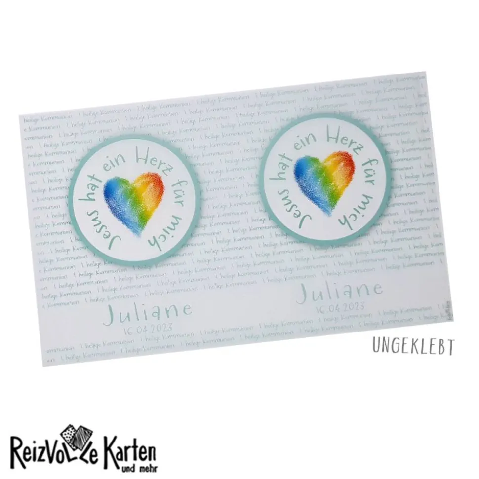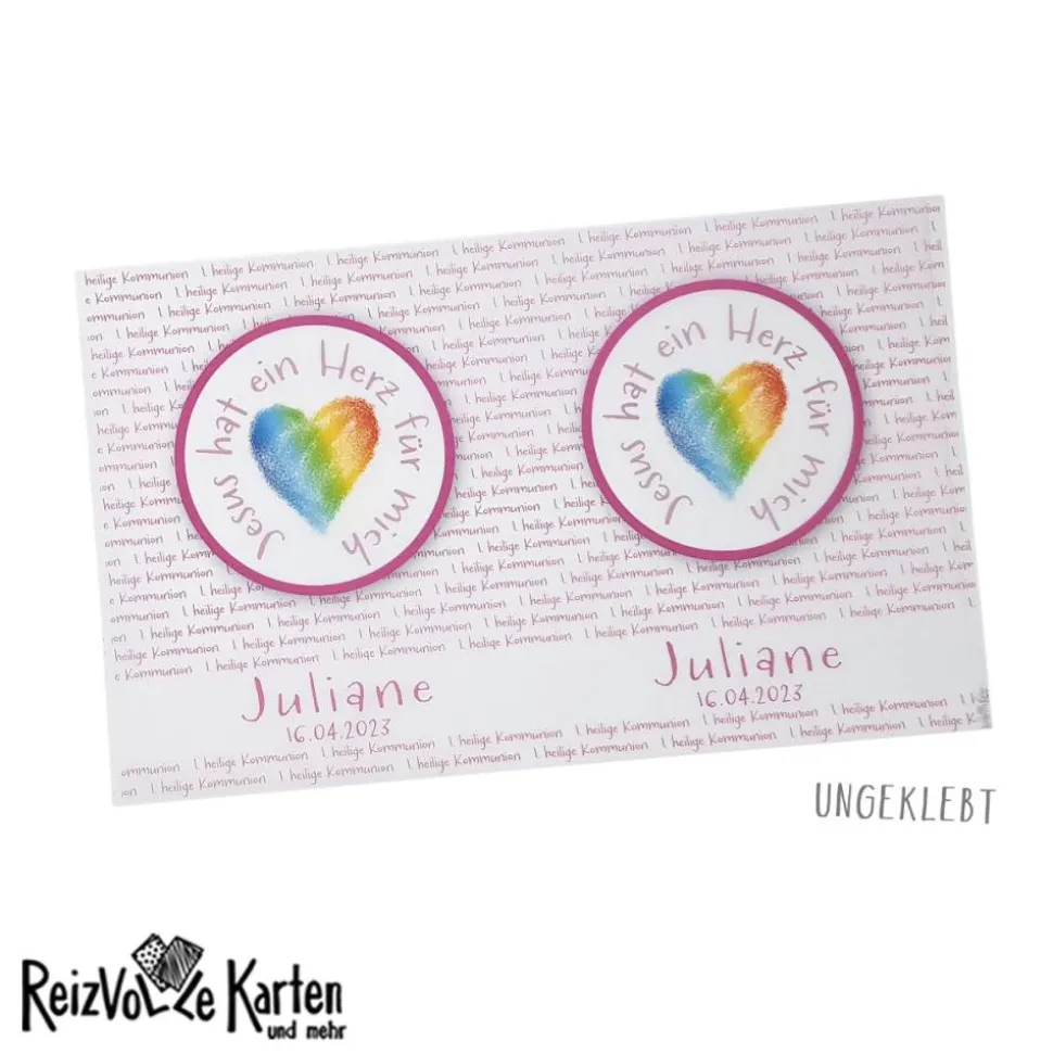Personalisierung leicht gemacht: Trage einfach den Namen des Kommunionskindes, das Datum der Feier und deine Wunschfarbe ein. Damit wird jedes Stück zum individuellen Highlight auf deiner Festtafel.