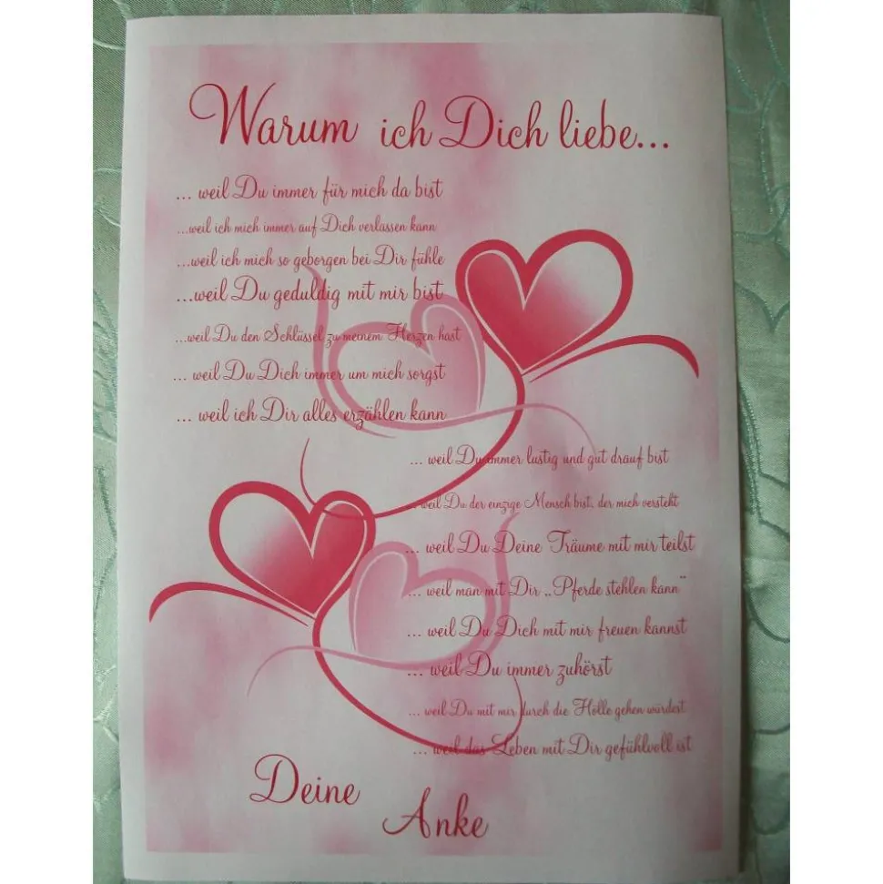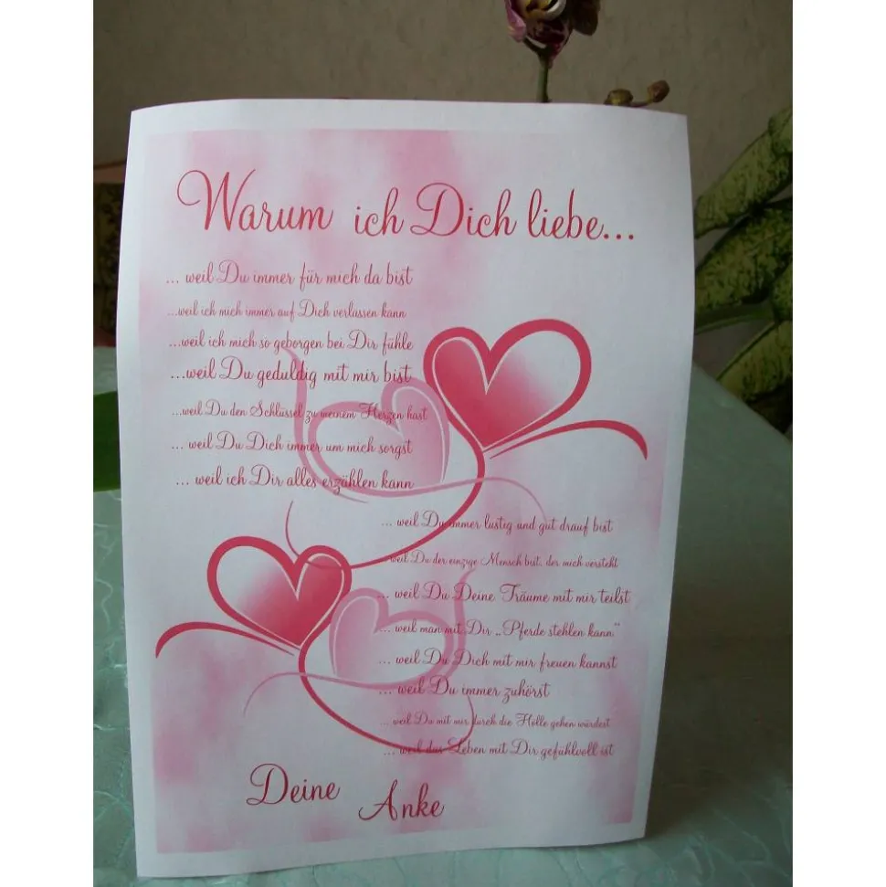 Material: Dieser schöne Liebesbeweis wird mit dem gewünschten Namen gestaltet und auf satiniertem hochwertigen 250 g/qm Karton gedruckt.
