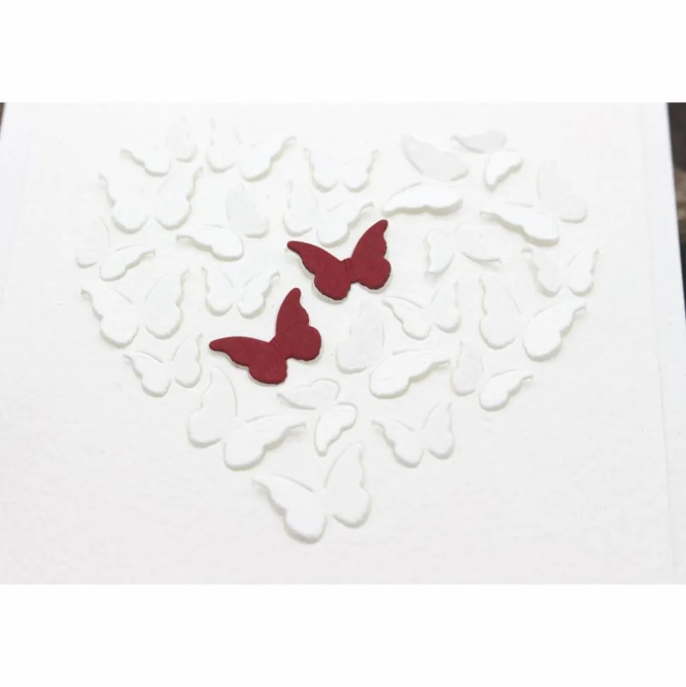 Den Mittelpunkt ein wunderschöner Schmetterlingsschwarm in Herzform, welcher aus Cardstock in den Farben rot und weiß besteht.