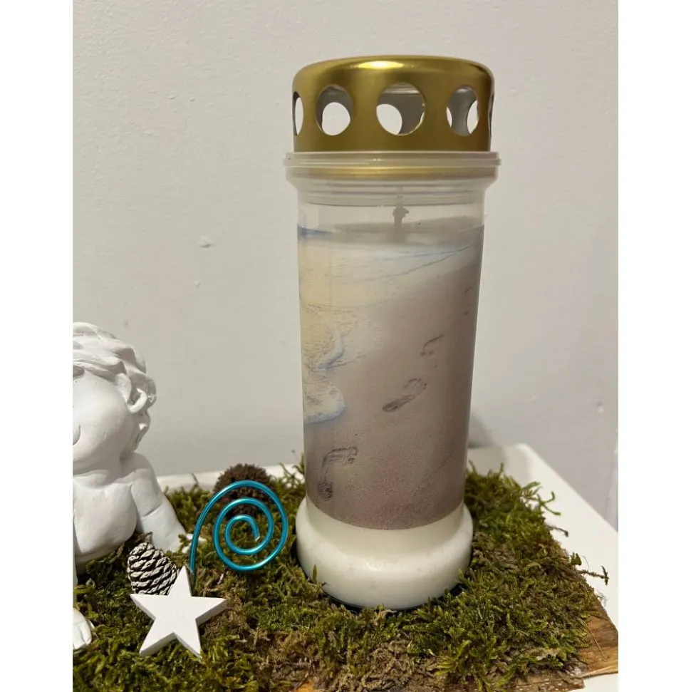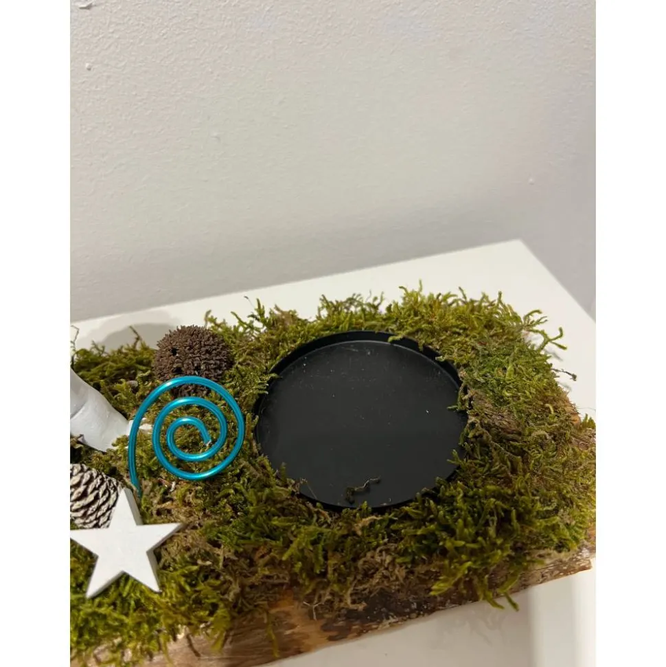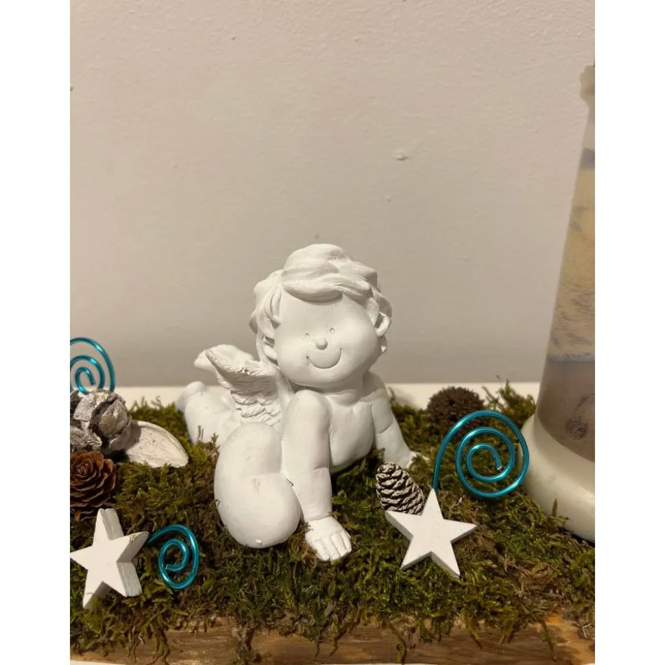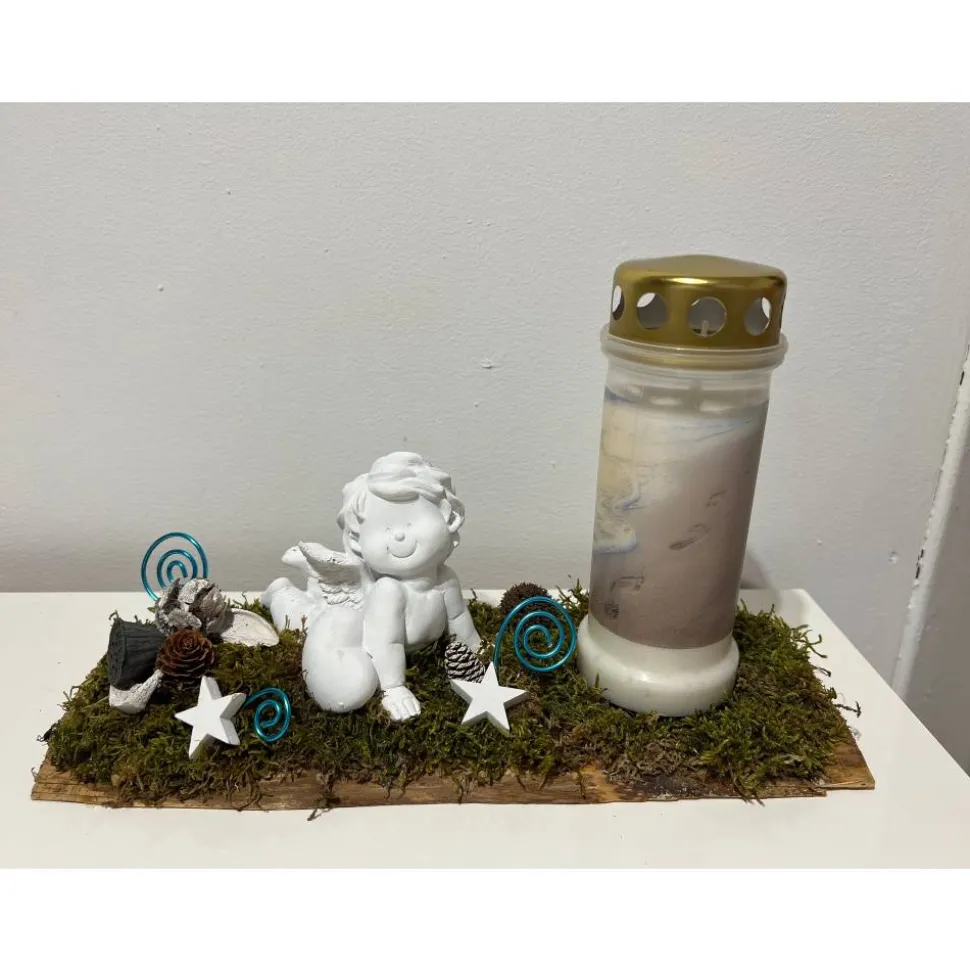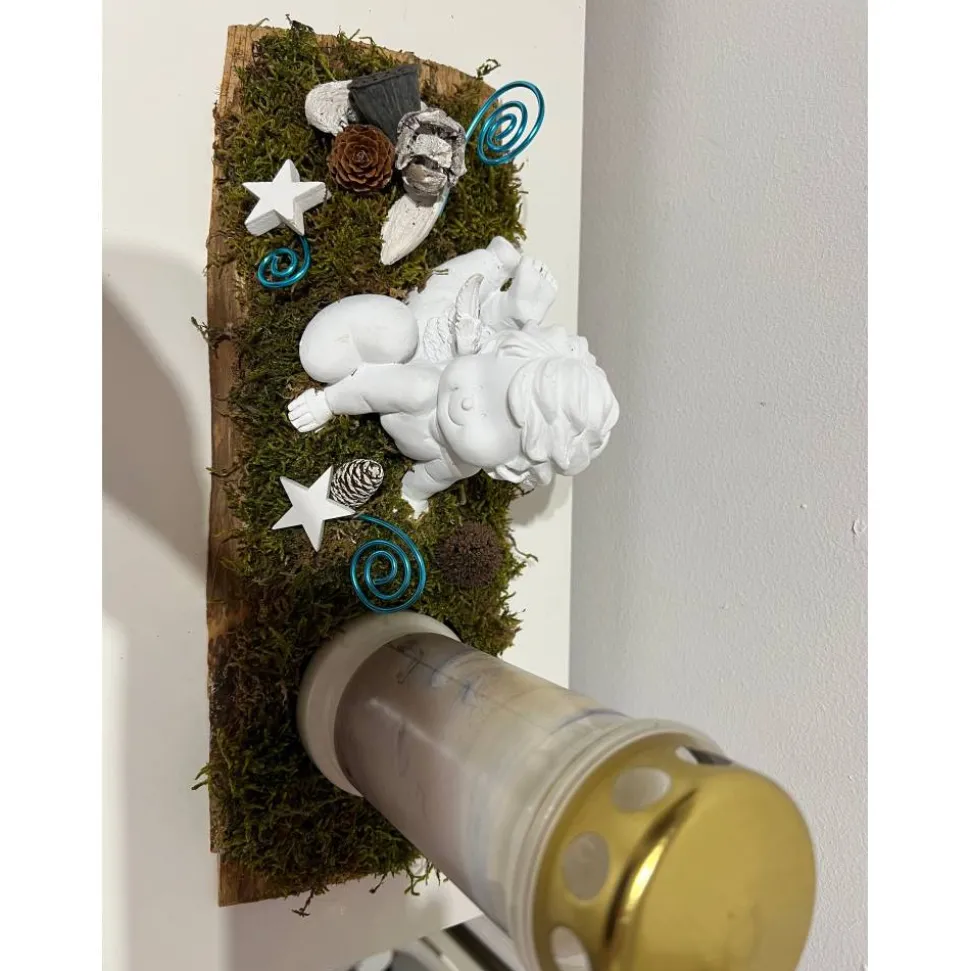 Es besteht aus einem Engel, einer Kerze, Sterne, Draht, getrockneten Moos und weiteren Dekoelementen.