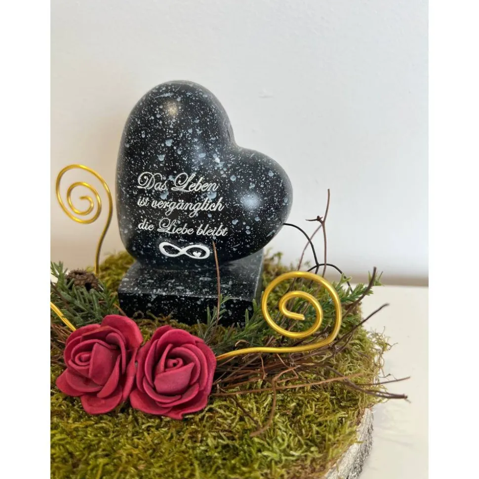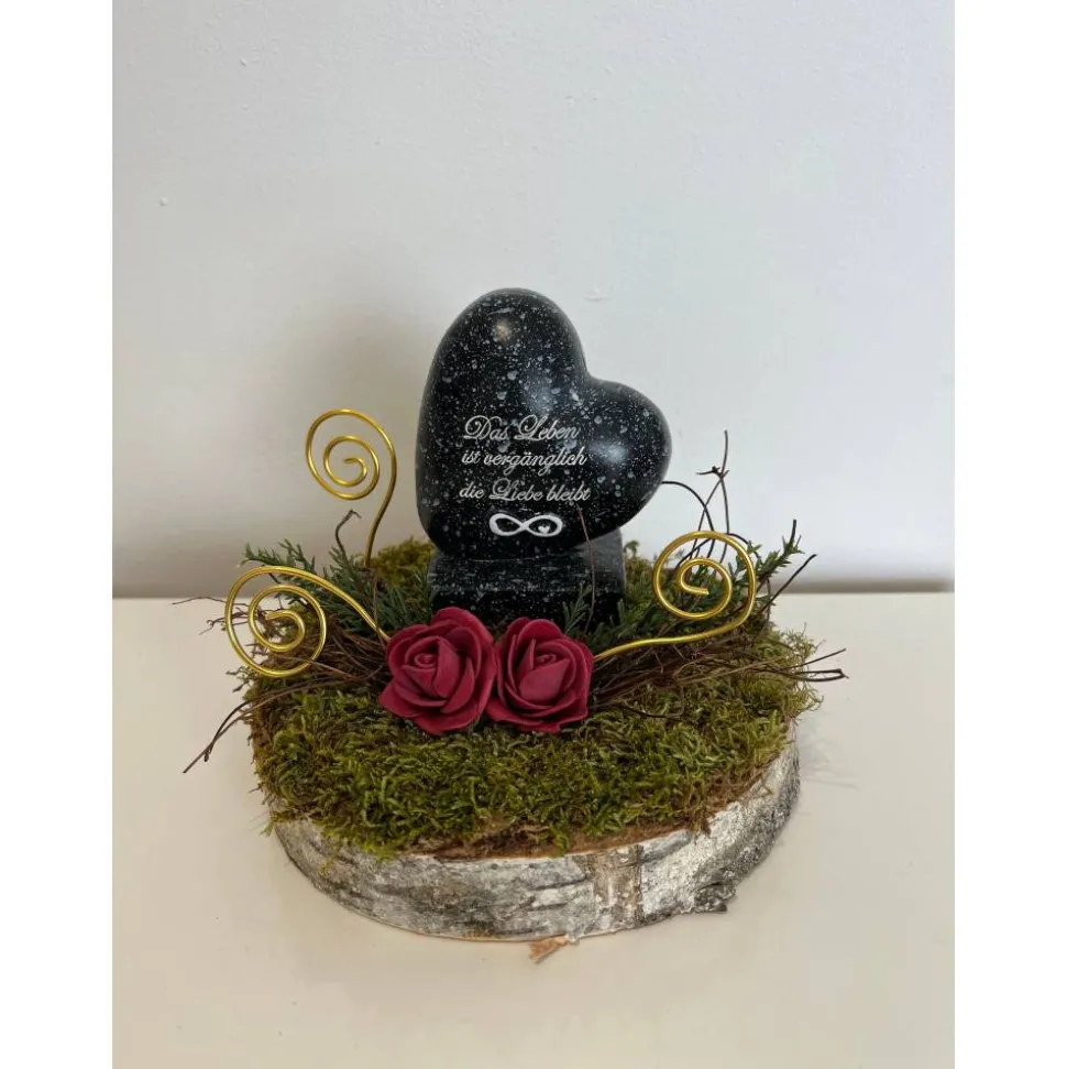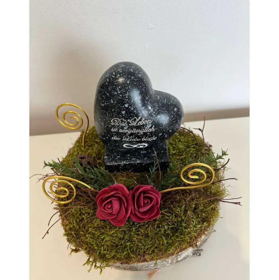 Es besteht aus einem Herz, künstliche Blumen, getrockneten Moos und weiteren Dekoelementen.